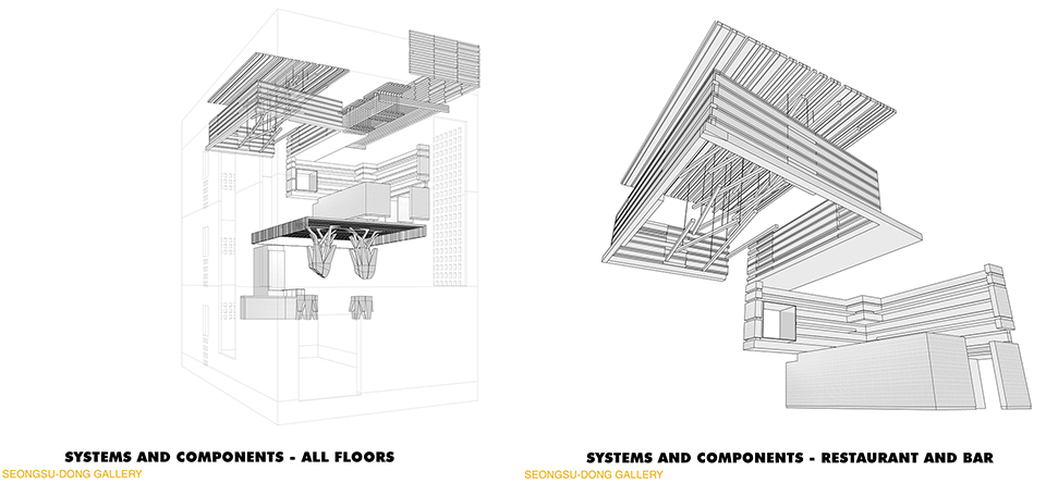 Morphosis was engaged to design the top three levels of a new tower under construction in Seongsu-Dong. Each level measures only 485sqft of leasable space; using the organizational and design concept of a treehouse and narrative of an ever-adapting “vine,” the three levels are programmed into a holistic ensemble: the office, the gallery, the restaurant bar, and roof terrace.