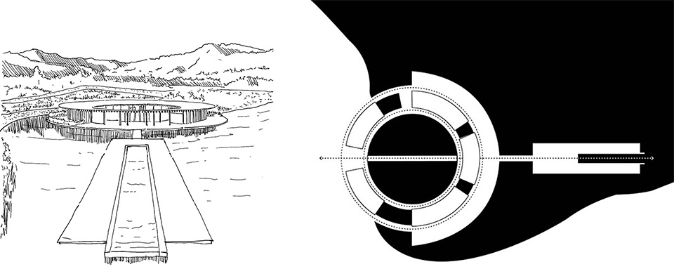 Following the guiding idea of a subtle and friendly approach between architecture and nature, the Clubhouse was conceptualized in reference to a boat anchored in the lake, as if it were floating on the water. In volumetric terms it is resolved by means of a circular floor plan fragmented around its radius to distribute and modulate the different areas and amenities it contains. This programmatic strategy is made visible in the voids and solids created by the internal bodies of water as they merge with the lake, and the walls that rise from the bottom of the lake.