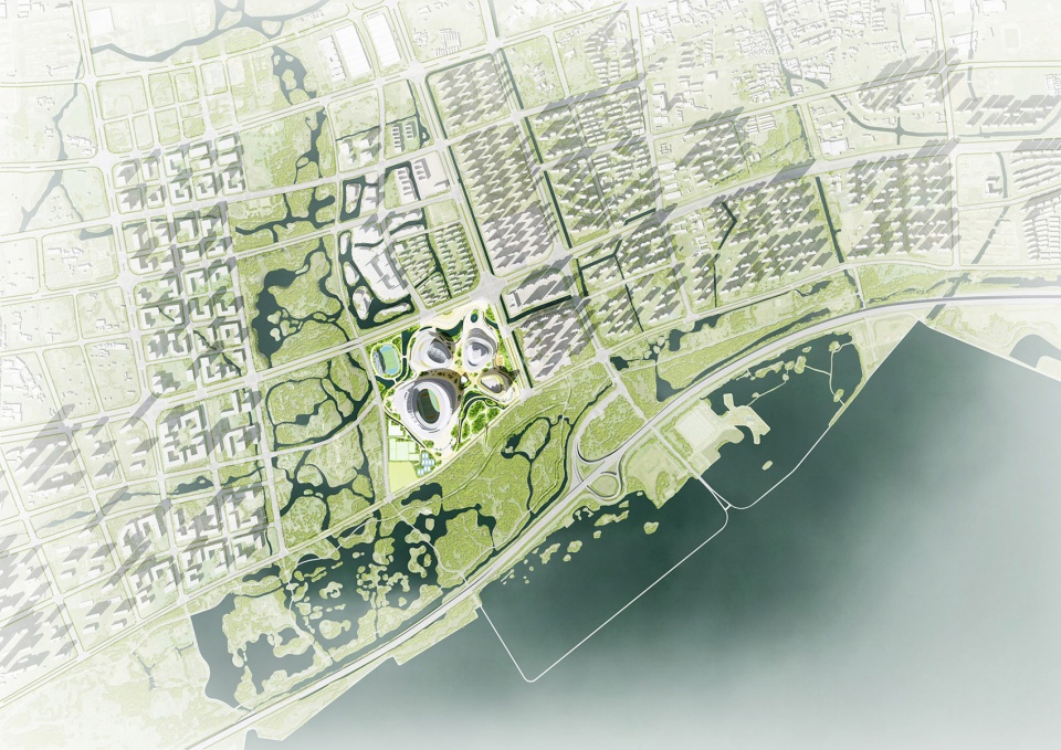Another important element of the design is the sponge city concept for the landscape park. The site is located in the wetlands of the River Shangxian and of Lake Taihu in the Yangtzekiang delta. In cooperation with WES LandschaftsArchitektur, gmp designed generous open areas, adopting and expanding the concept of a meadow park. Natural waterways are integrated in the landscape design. With the help of modern rainwater management with a flood control basin and natural swales, the landscape is capable of absorbing large quantities of water and of releasing it again slowly over time. This helps to prevent floods and supports an agreeable climate.