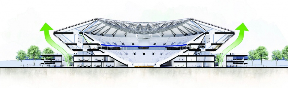 无锡奥体中心是无锡市为减少温室气体排放,提高该地区气候适应能力的几个标杆项目之一。gmp与ARUP合作为奥体中心提出整体可持续概念。整体节能概念包括从用地日光照射和风能角度优化的城市规划、自然通风以及对太阳能、地热能和风能的利用。