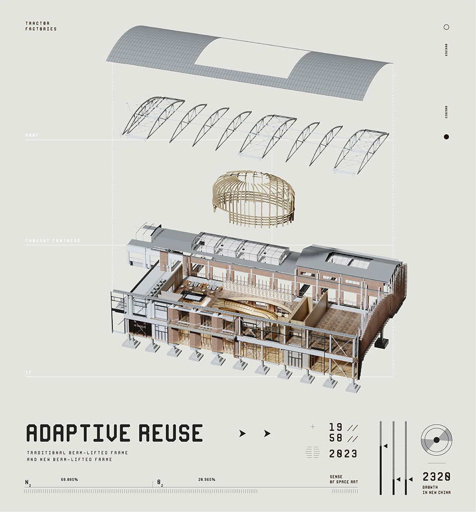 Changchun Tractor Factory, founded in 1958, was once the largest production base of wheeled tractors in China, and it also carries the memory of a generation of the city. Today, the factory that has been abandoned for more than 60 years gathers the core needs of multiple sections, takes urban life as a starting point, integrates public resources such as architecture, landscape, art, cultural creativity, and commerce, and creates a vibrant urban living room.