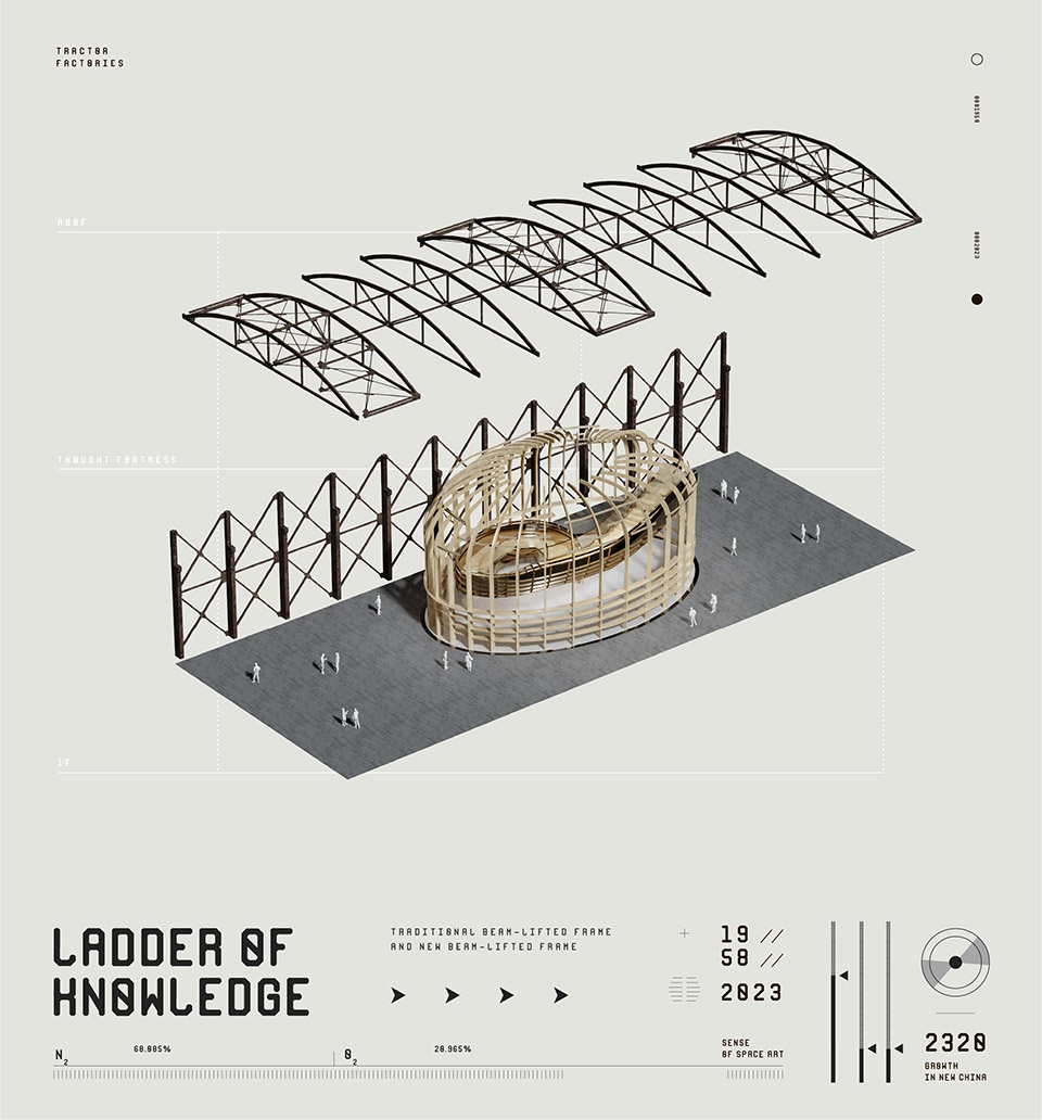 思想堡垒作为中央焦点岛屿吸引人流自然进入,巨大的穹顶装置沿用厂房建筑的排架结构,将凝练的建筑形式置入空间之中,兼具功能与自然宁静的装置美学。