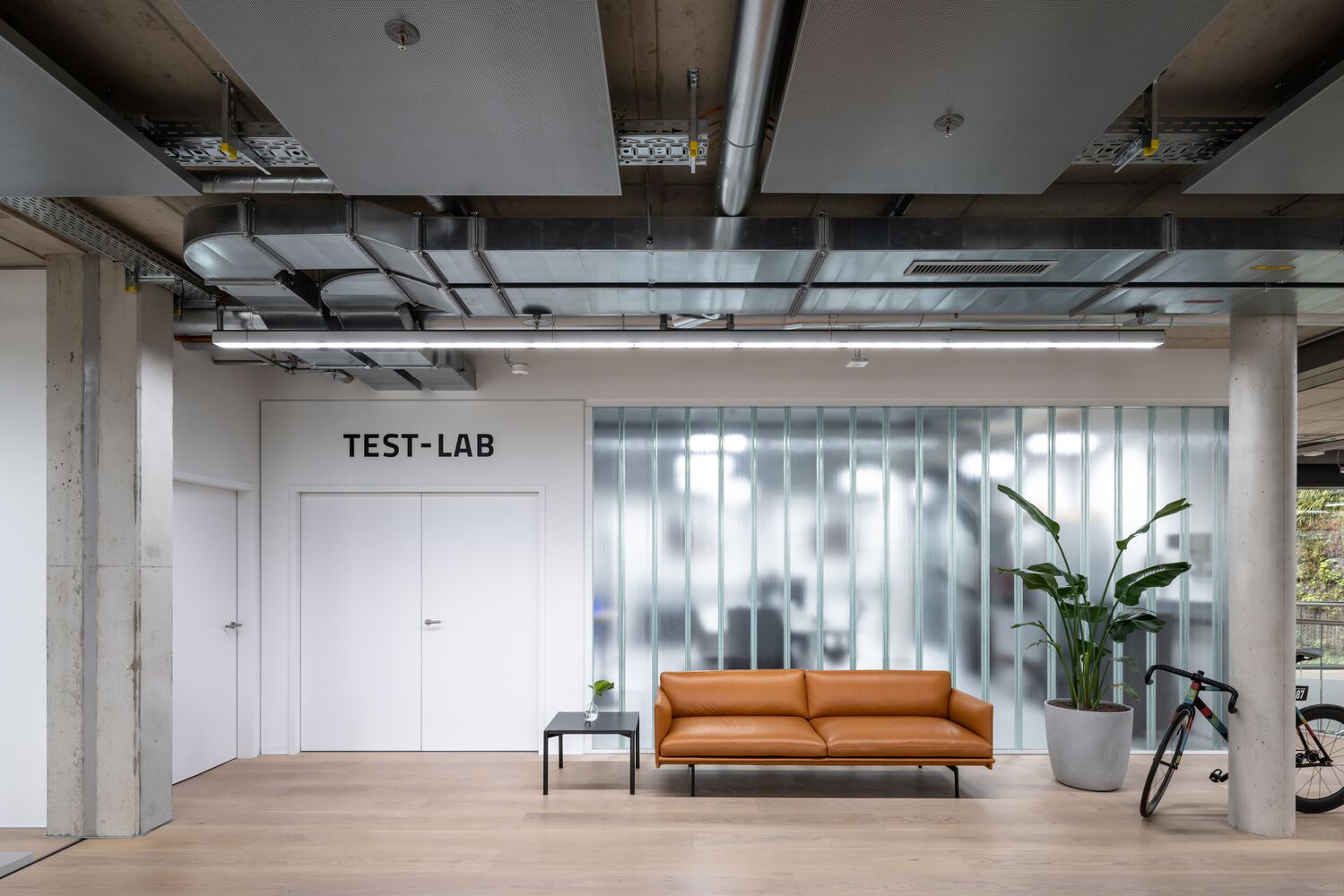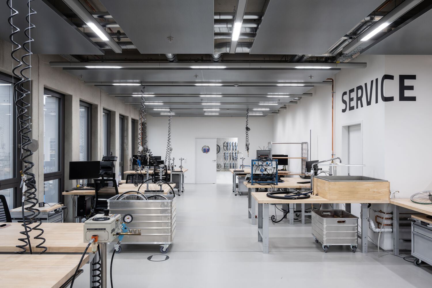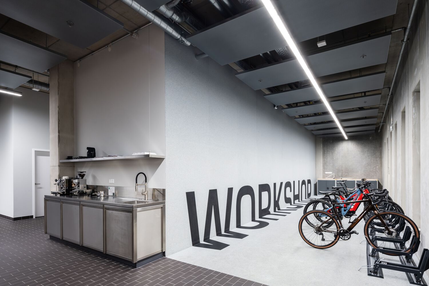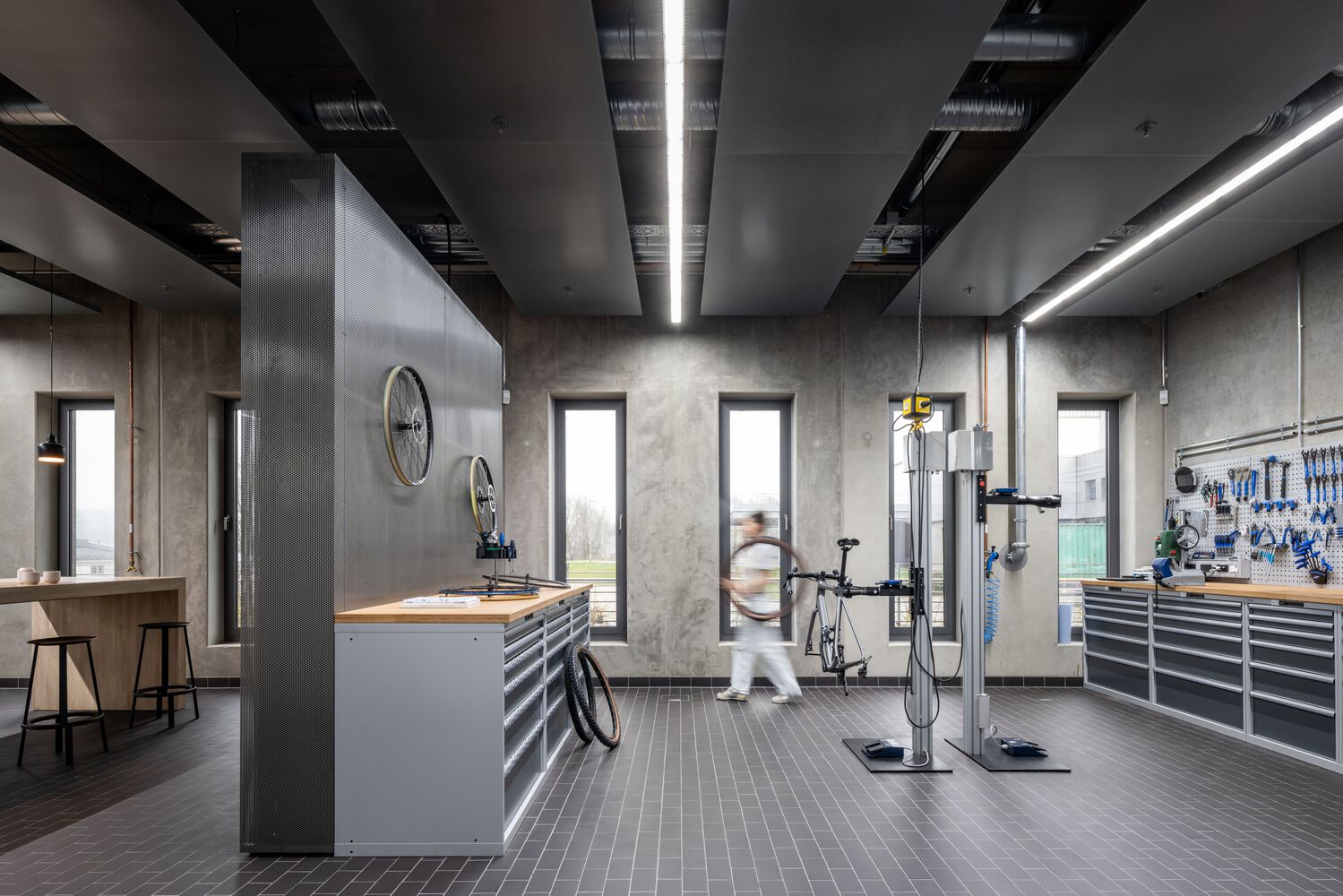 自行车车间被设计成街道的延伸,欢迎任何自行车爱好者经过。耐用的街道瓷砖、墙壁上的再生橡胶、不锈钢和动态字母是这个空间的主要特征。位于第一层的客户服务是一个清晰、简约的环境,以功能为主。建筑师特意展示了工业元素和工具,以展示正在进行的工作的美丽以及该部门在公司日常运营链条中的宝贵作用。桌面上的橡胶木和 C2C 认证的橡胶地板都能够承受任何工作任务。选择半透明 U 型玻璃来划分办公区域并创建会议室。这种生态玻璃适合智能建筑,是当今最可持续的建筑产品之一。