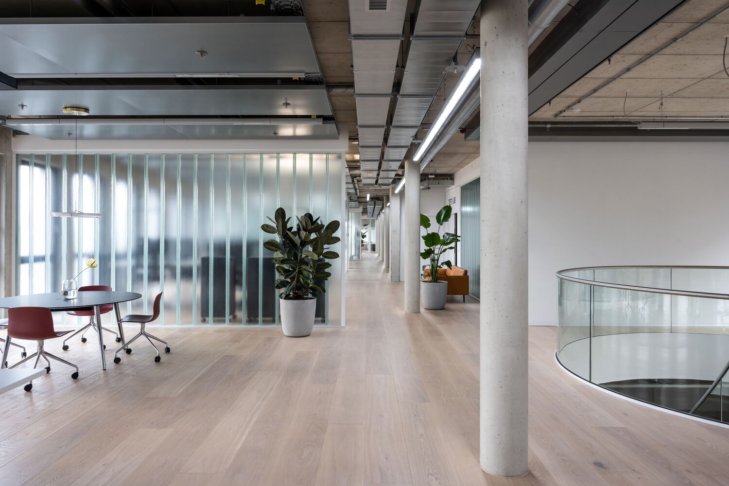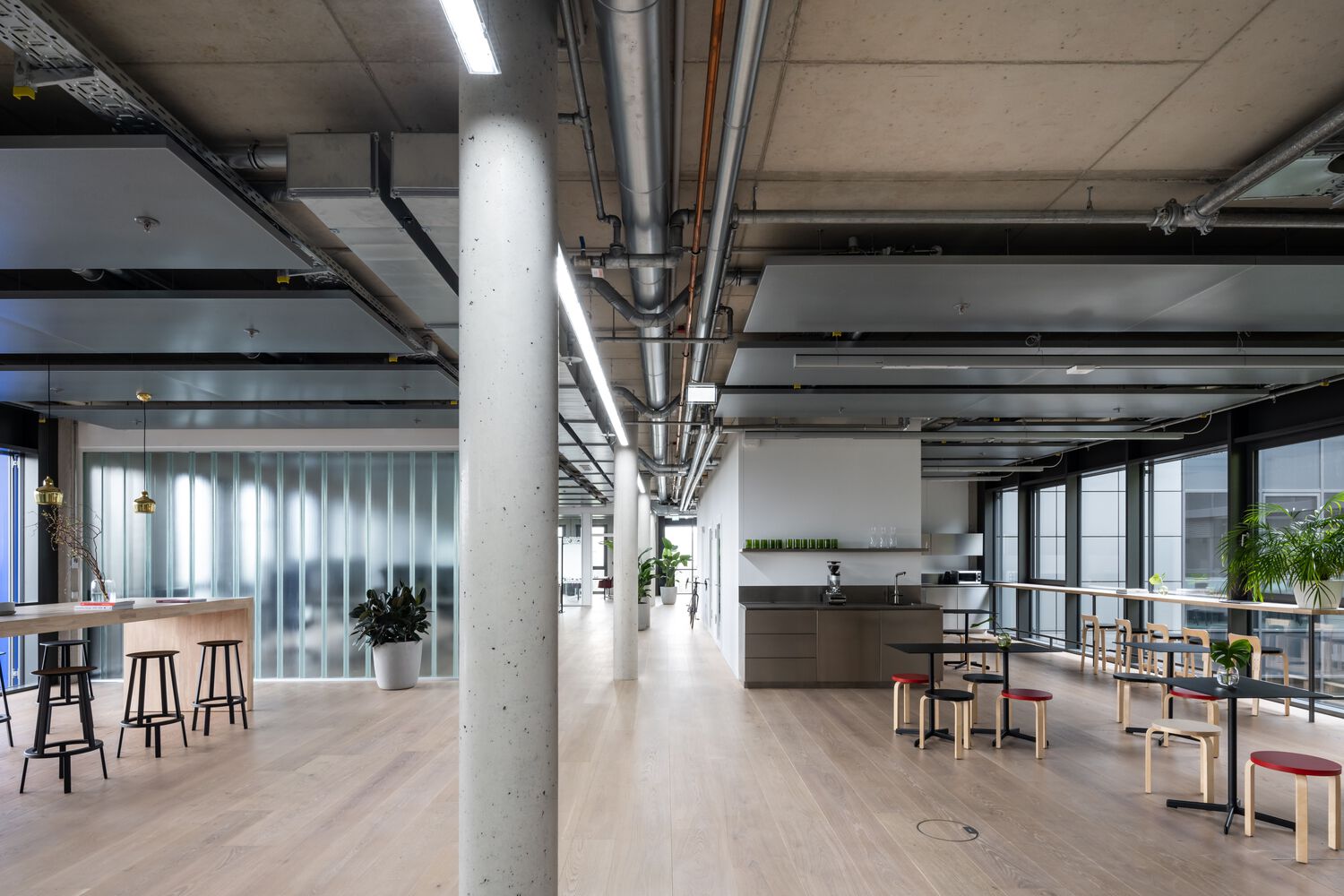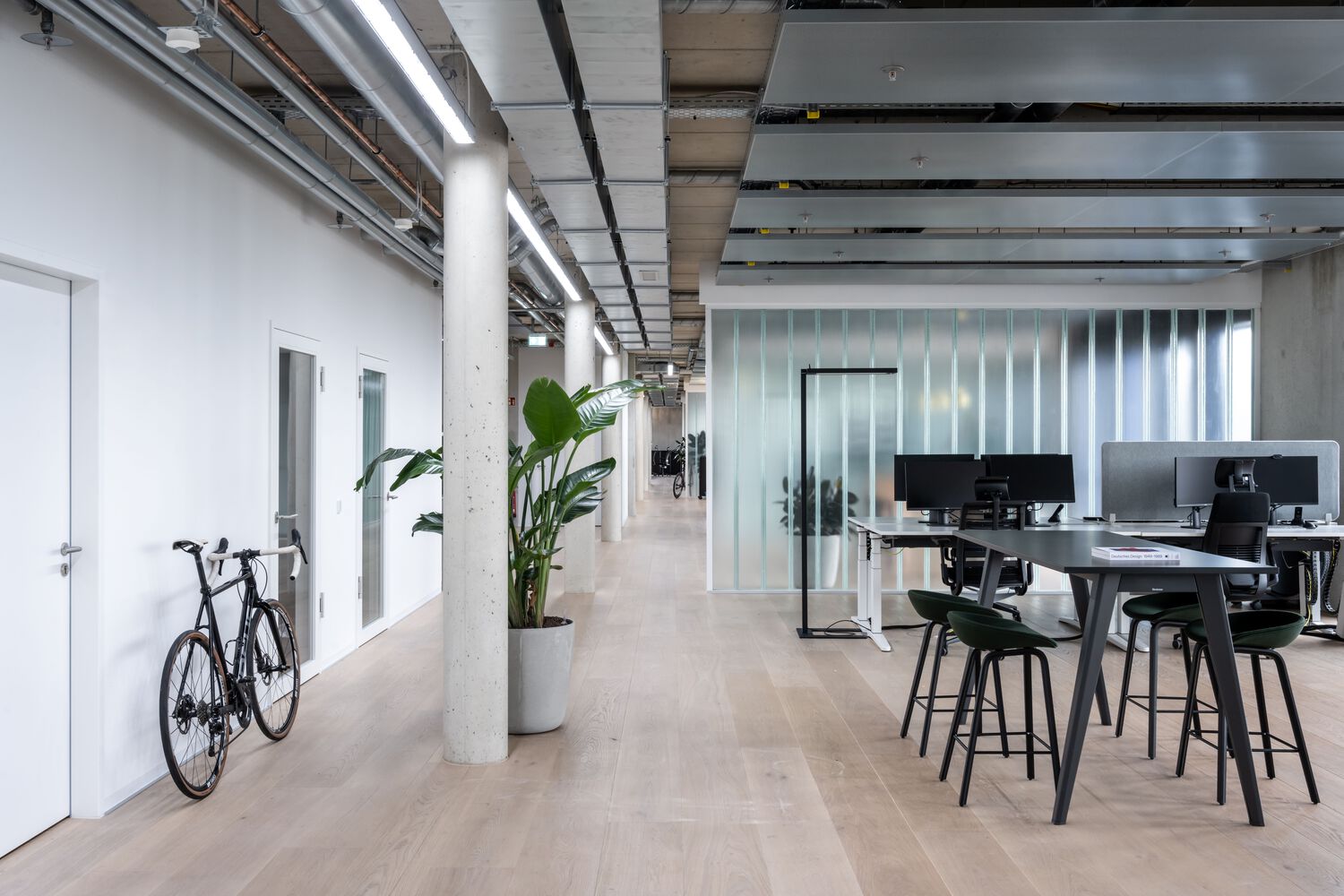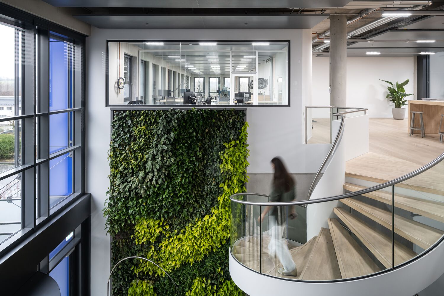 办公室选用的家具大多是经过摇篮到摇篮认证的产品或具有长久使用寿命的标志性设计。浅色木地板和各种绿色休息室营造出友好舒适的工作和休闲环境。客户特别关注连接新旧建筑的桥梁。决定不再将桥仅仅用作通道,因此提出了包括活动空间的布局方案。这座桥成为了一个“公共休息室”,两座大楼的员工可以在中途见面打乒乓球比赛或举办休闲会议。桥的全玻璃面允许更多的日光,并为午餐休息提供额外的户外环境。为了更快地进入,可以使用踏板车过桥。