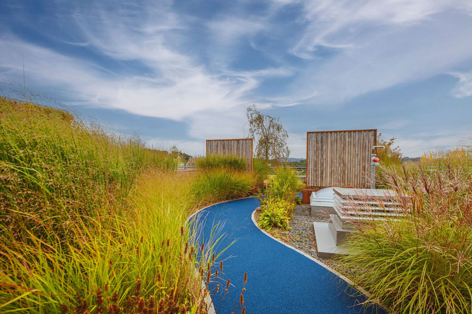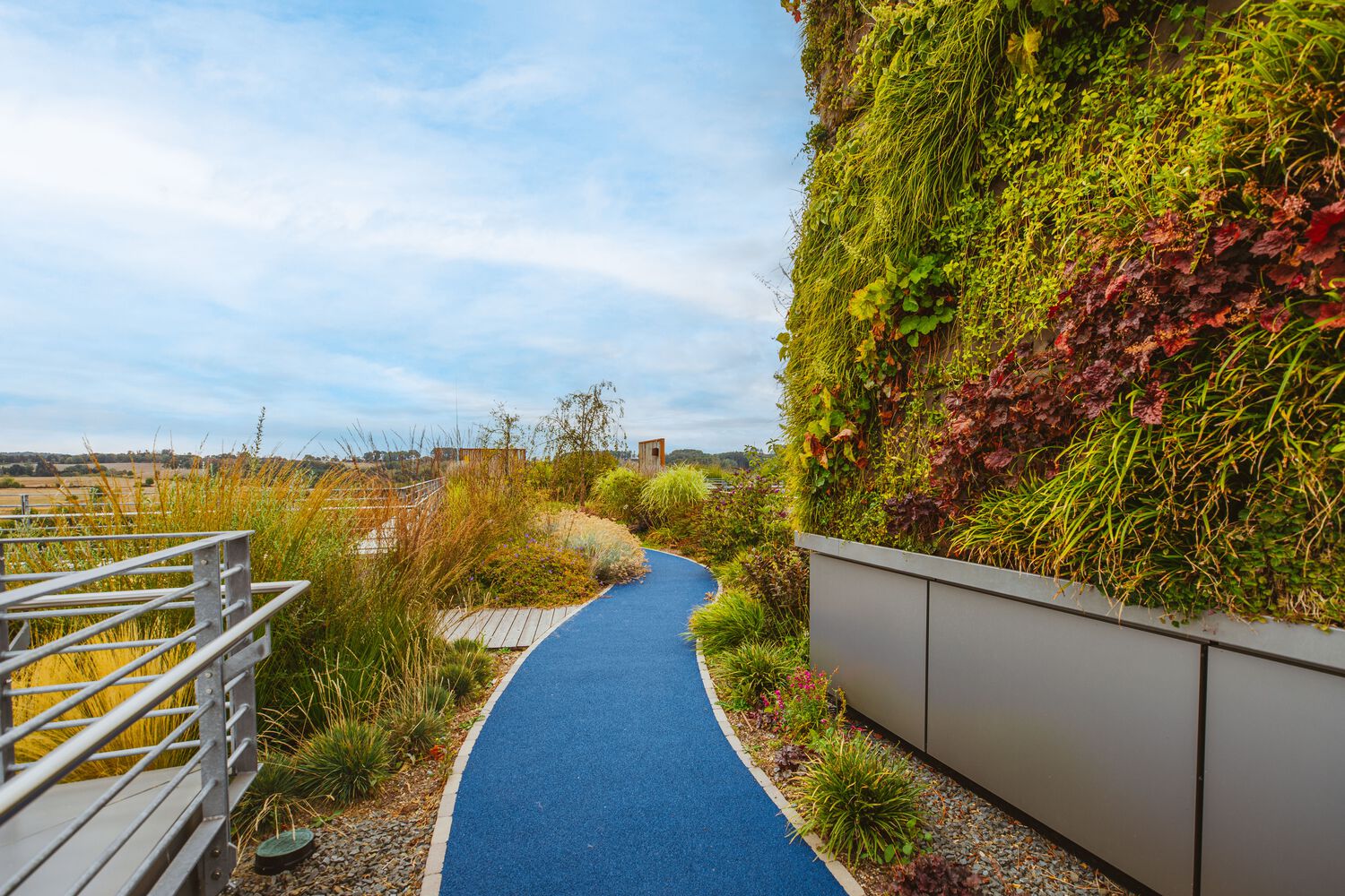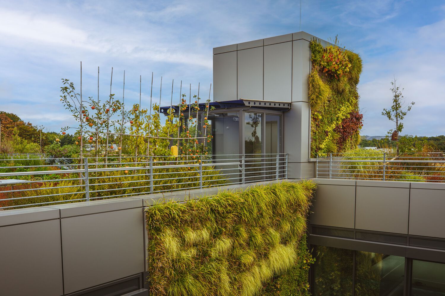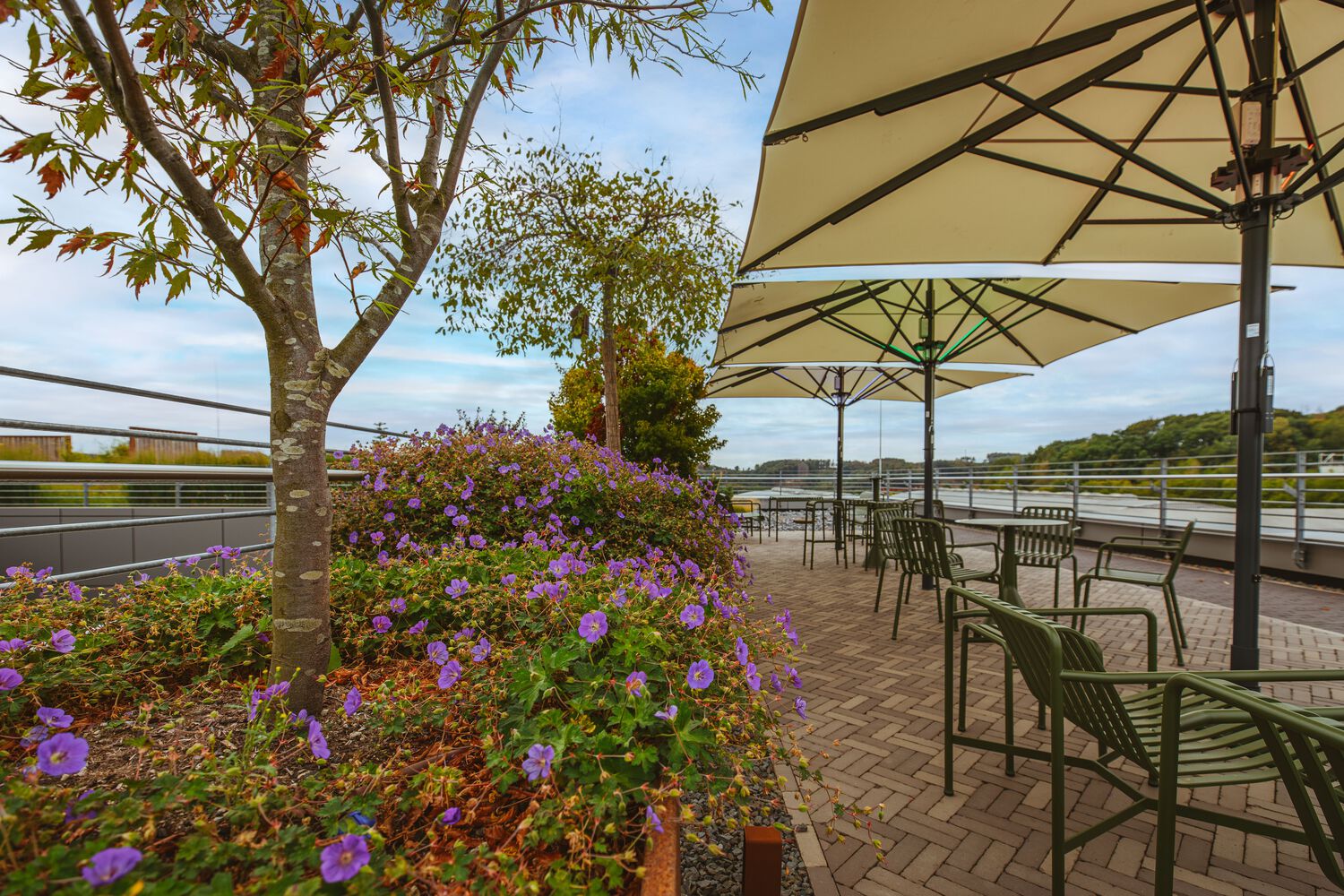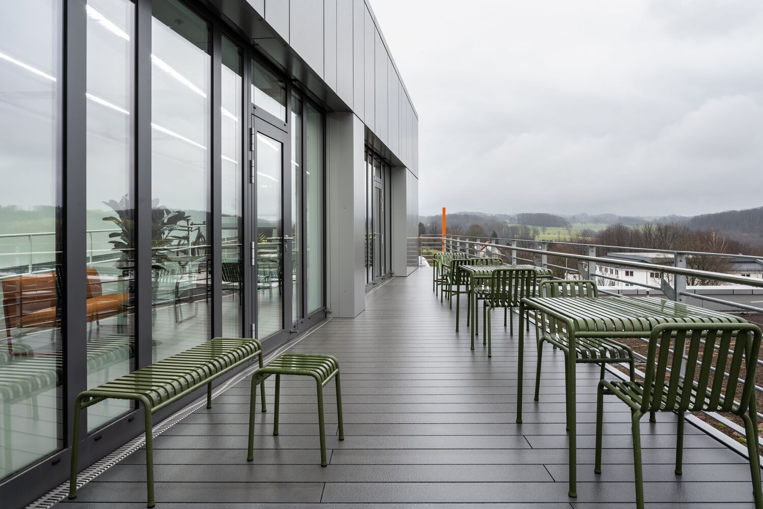 办公室选用的家具大多是经过摇篮到摇篮认证的产品或具有长久使用寿命的标志性设计。浅色木地板和各种绿色休息室营造出友好舒适的工作和休闲环境。客户特别关注连接新旧建筑的桥梁。决定不再将桥仅仅用作通道,因此提出了包括活动空间的布局方案。这座桥成为了一个“公共休息室”,两座大楼的员工可以在中途见面打乒乓球比赛或举办休闲会议。桥的全玻璃面允许更多的日光,并为午餐休息提供额外的户外环境。为了更快地进入,可以使用踏板车过桥。