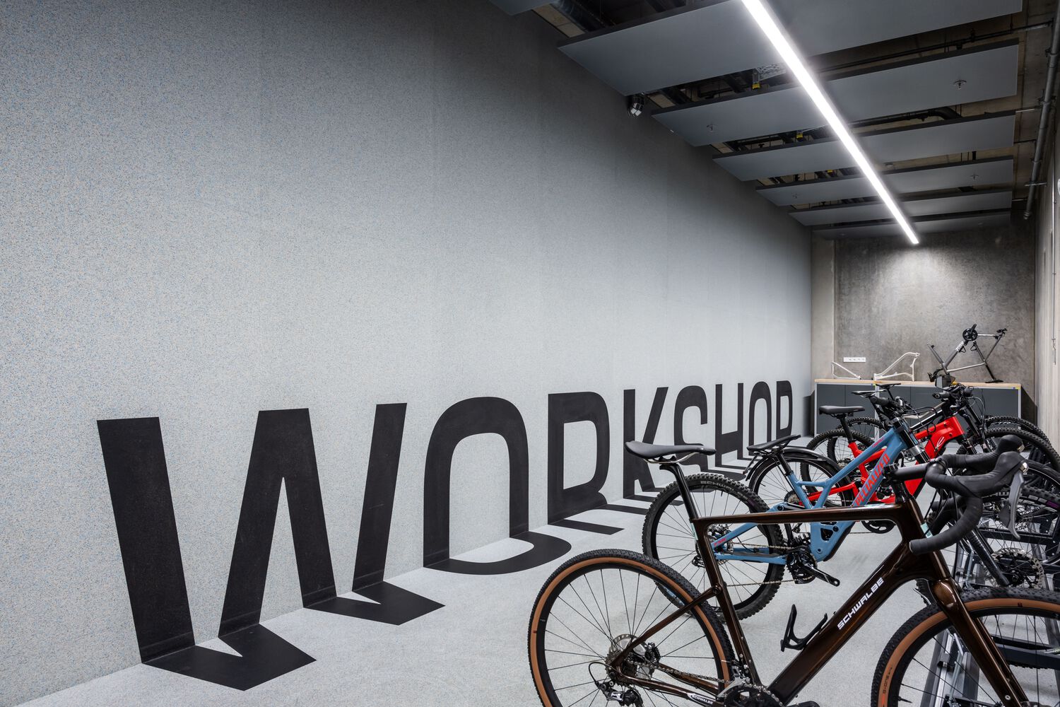 因此,这座巨大建筑的使用者感觉更加团结,参观者也可以一睹 Schwalbe 不同部门的幕后花絮。一楼有两个主要入口,一个通过正式接待处,一个通过自行车车间。接待区的中心是一堵巨大的定制橡胶木墙,让人想起自行车轮胎上的图案。与接待区典型的亮度相反,Peter Zumthor – Candela Di Vals 采用温暖而简约的灯光,营造出平静祥和的氛围。