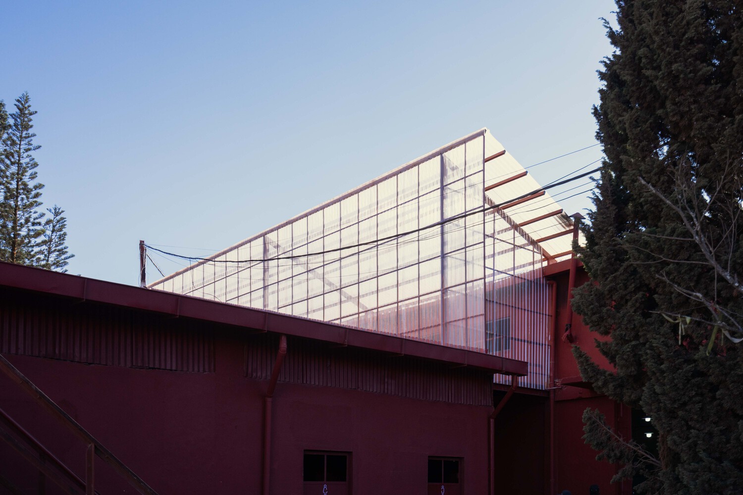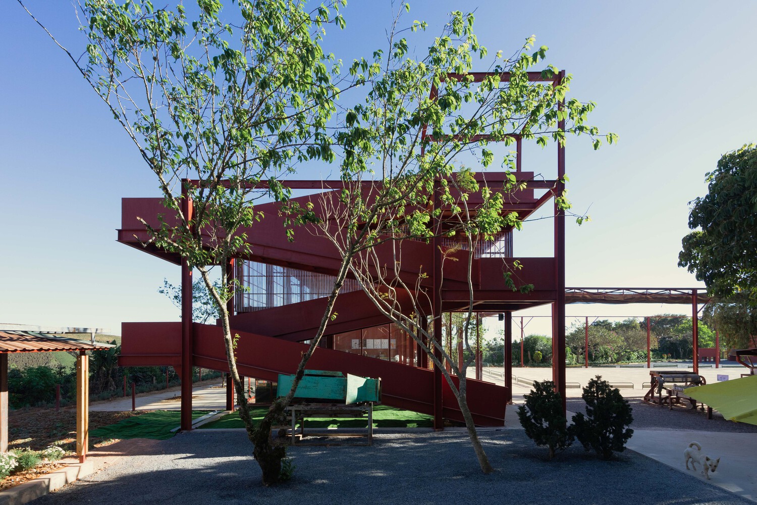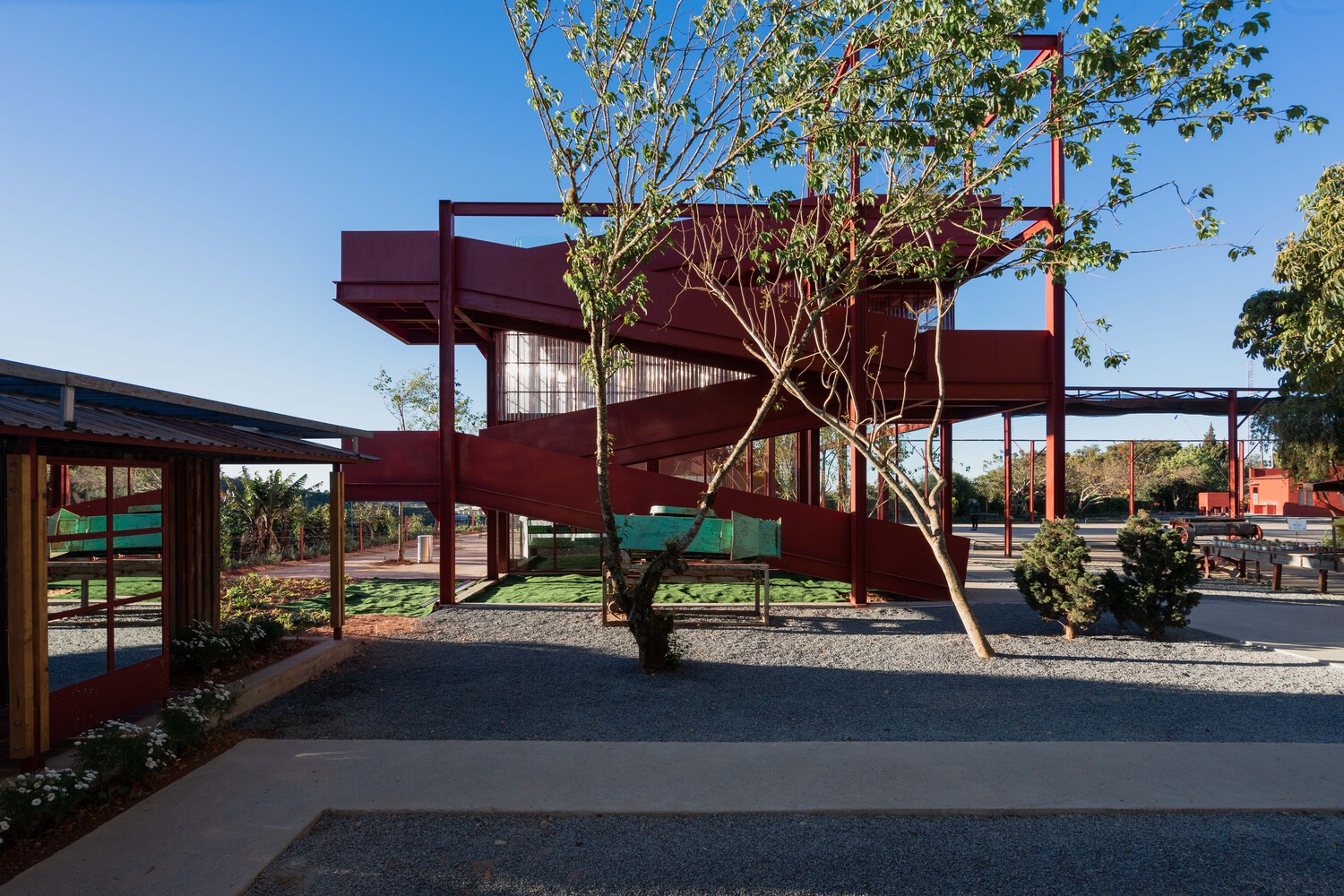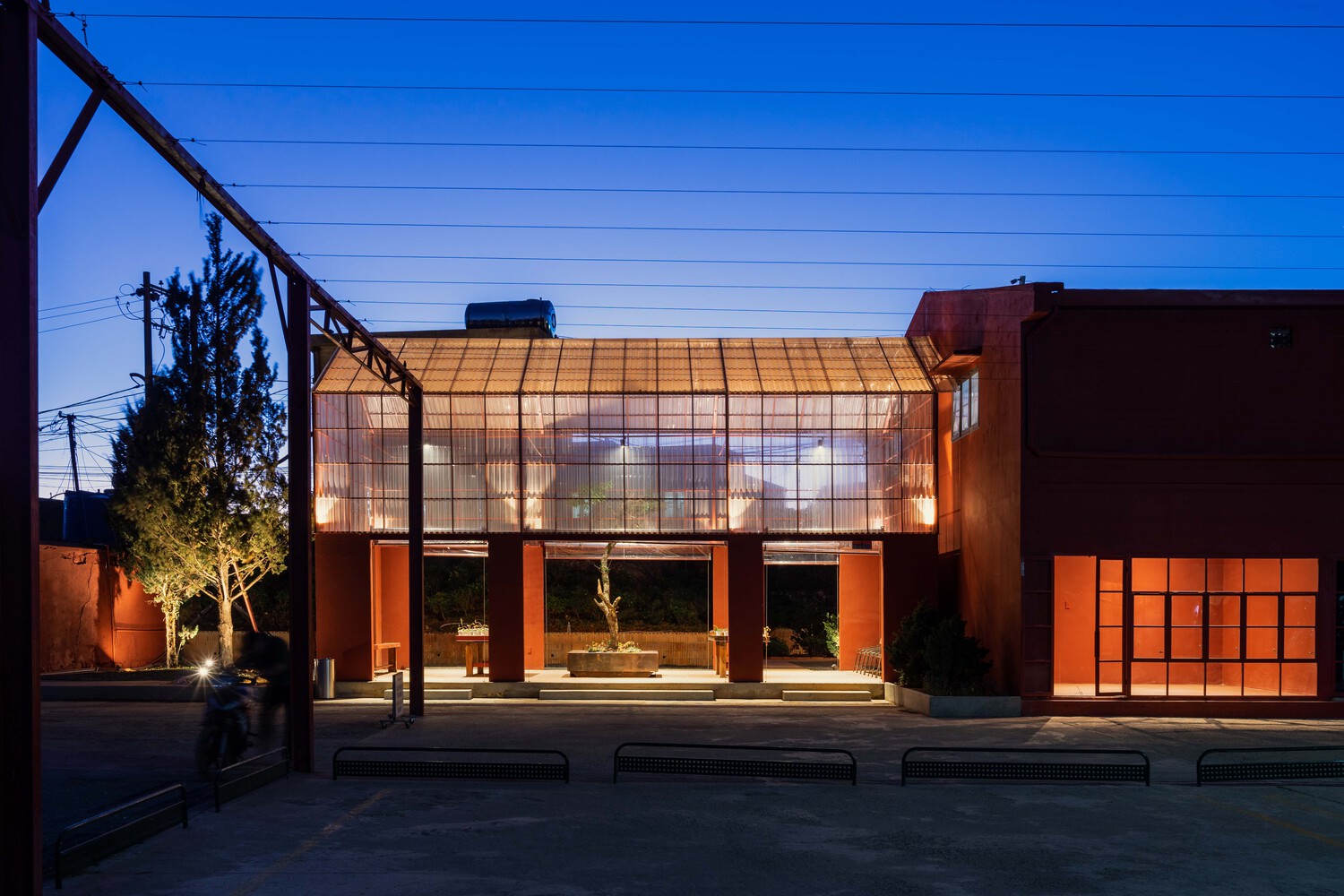 使用的材料非常简单,大多是翻新的钢材、聚碳酸酯板、当地的砖和现场的水泥土混合物。甚至艺术品也是用茶叶制成的,并通过将泥土与丙烯酸混合来绘制。建筑物的外部涂有新的防锈漆,旨在使其从邻居中脱颖而出。此外,这种颜色将成为未来 3D 绘图项目的巨大画布。