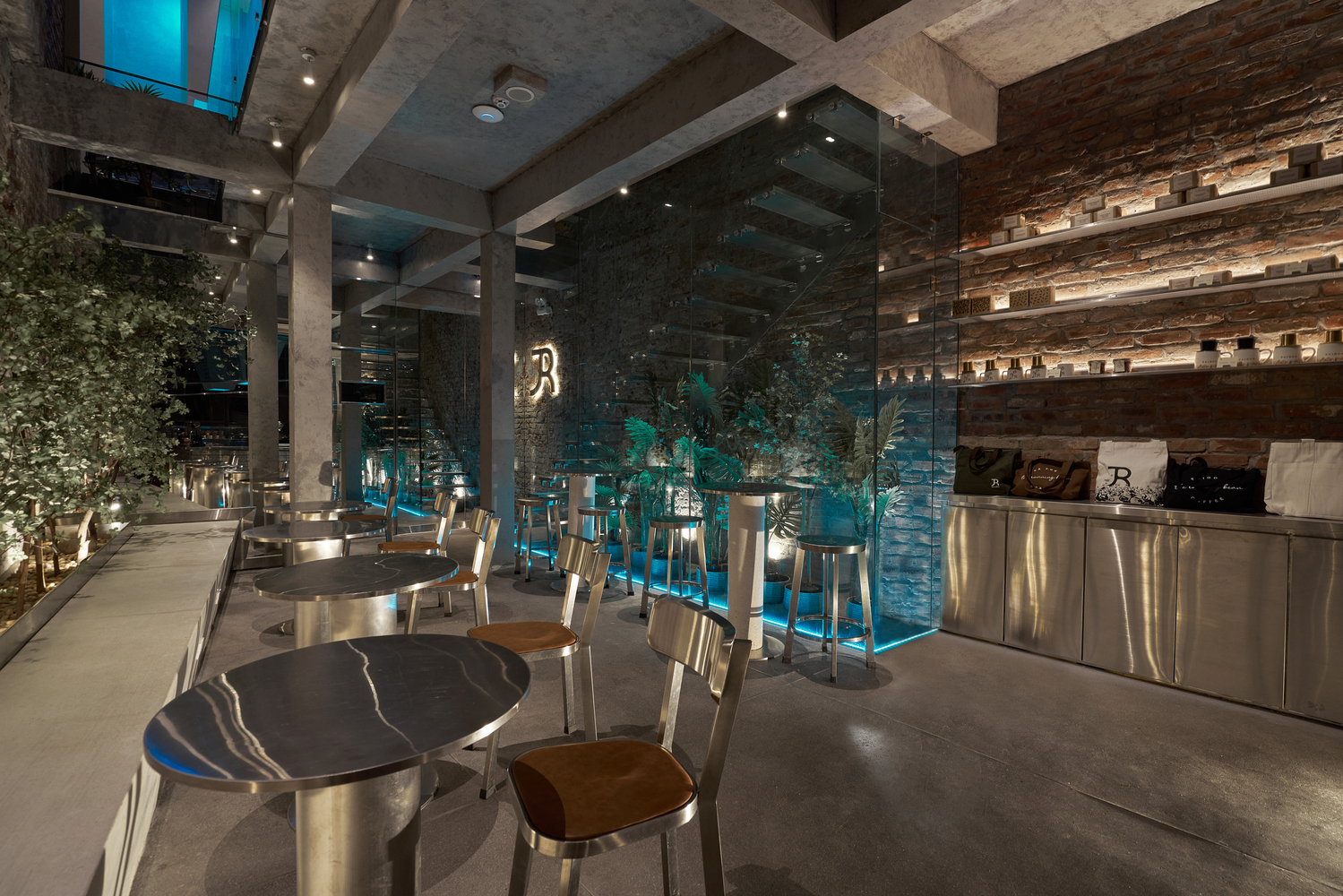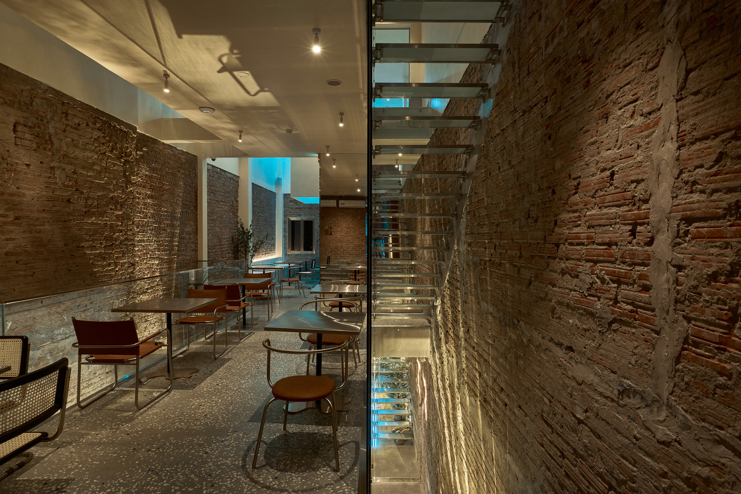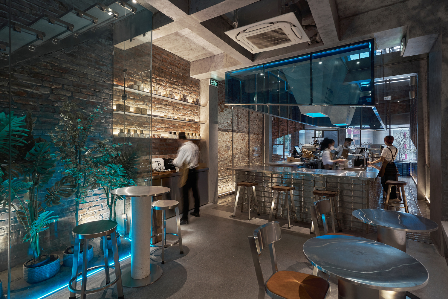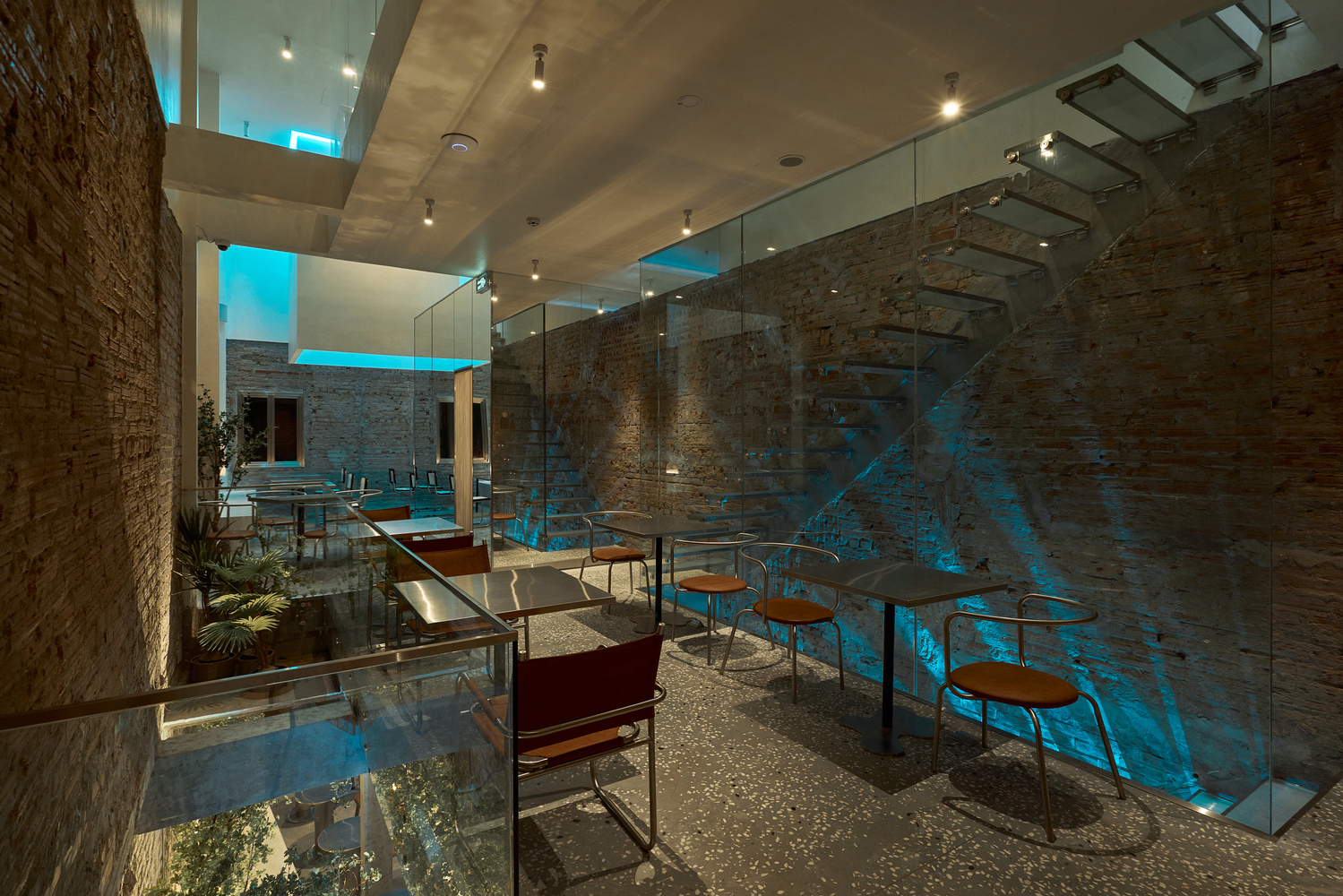 至于旧砖墙,部分保留,部分与灰白色效果墙结合。到了晚上,整个空间都被蓝色 LED 灯覆盖,反映出冰山的感觉——与底层相同。由于需要扩大面积和座位数量,我们将结构从两层改为三层加上交织的夹层。天花板被推高,创造出自然光的空间,首先克服了光线不足的问题。