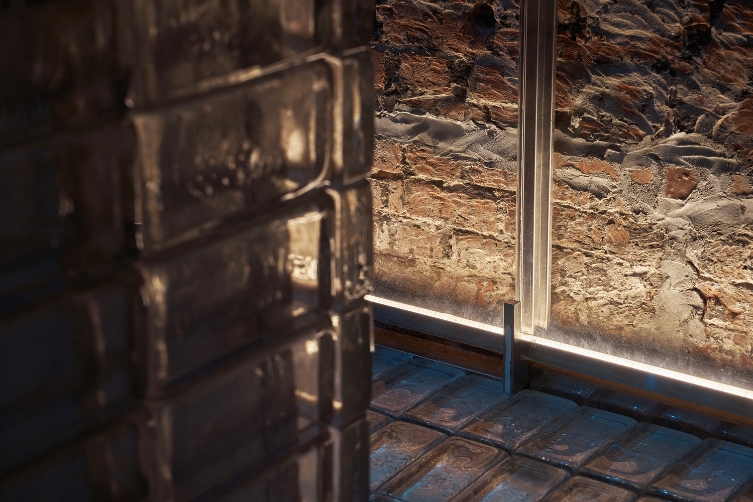 建筑物的正面被剥去旧砂浆层,露出旧砖墙。哥特式图案采用不锈钢包裹,更具现代感。我们不再从正门直接进入建筑,而是把它推得更深一些,入口门现在由玻璃墙组成——由两种不同类型的透明和半透明玻璃镶板,形成透明冰块的形象里面有切口。进去的时候,有一层玻璃砖地板,露出下面的生水泥地板。