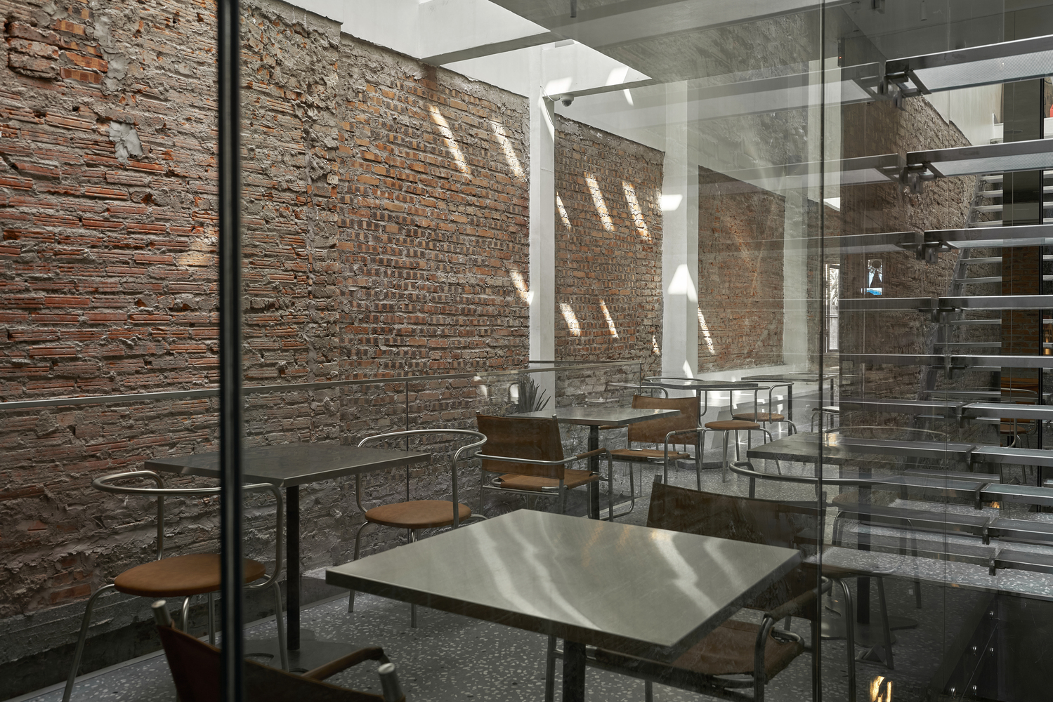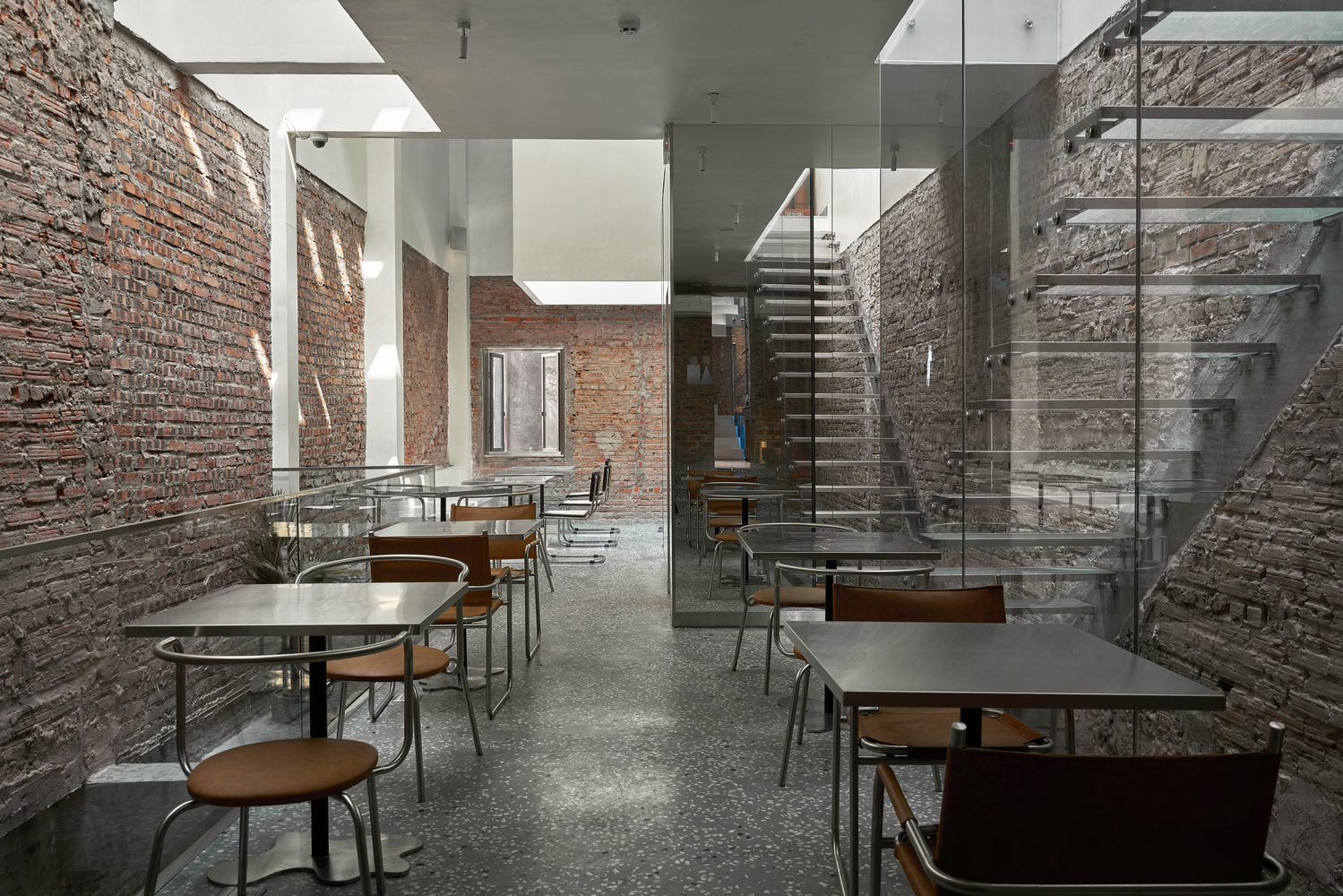 该项目的整个家具都是由与空间产生共鸣的材料制成的:不锈钢、工业皮革、水磨石、旧木材和房子的旧砖遗骸。