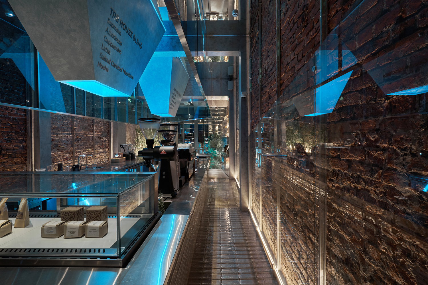 底层的中心是开放式咖啡柜台,由透明玻璃砖和不锈钢制成。柜台上方有一个由蓝色玻璃和不锈钢制成的对角矩形块,与冷冻运动产生强烈共鸣。我们还去除了两个侧壁上的饰面砂浆层,并放置了额外的斜面玻璃层以匹配倾斜的柜台天花板。由于宽度的缺点,我们想增加建筑原有的高度,我们通过放置额外的一层镜子来使其感觉更高、更通风。为了完成它,选择黄色光层作为主光,但我们在柜台天花板内添加了一层蓝色光,以创造色彩效果和冰山的感觉。