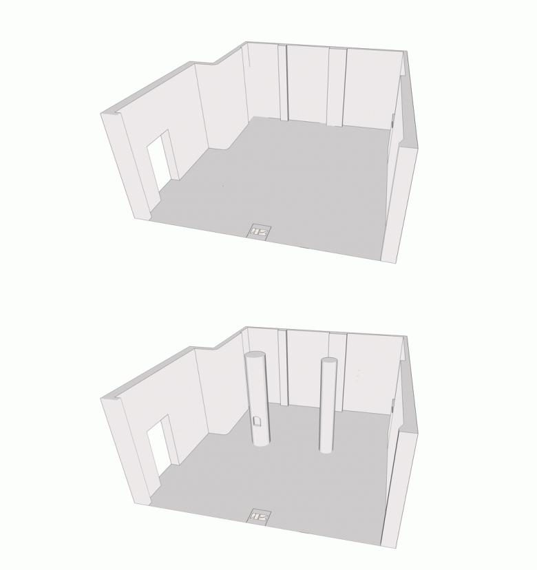 建筑物的高度比较高。拆除工程完成后,中间两根立柱的出现将空间支撑成方盒结构。至于如何摆脱局促的方形感,设计师围绕中场柱子做了一些结构处理:内场部分建在两层,上层作为橱窗展示和储物空间。