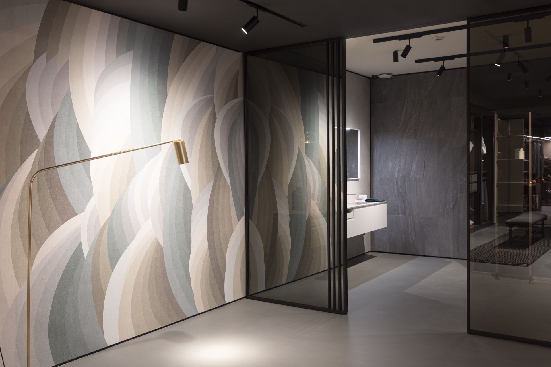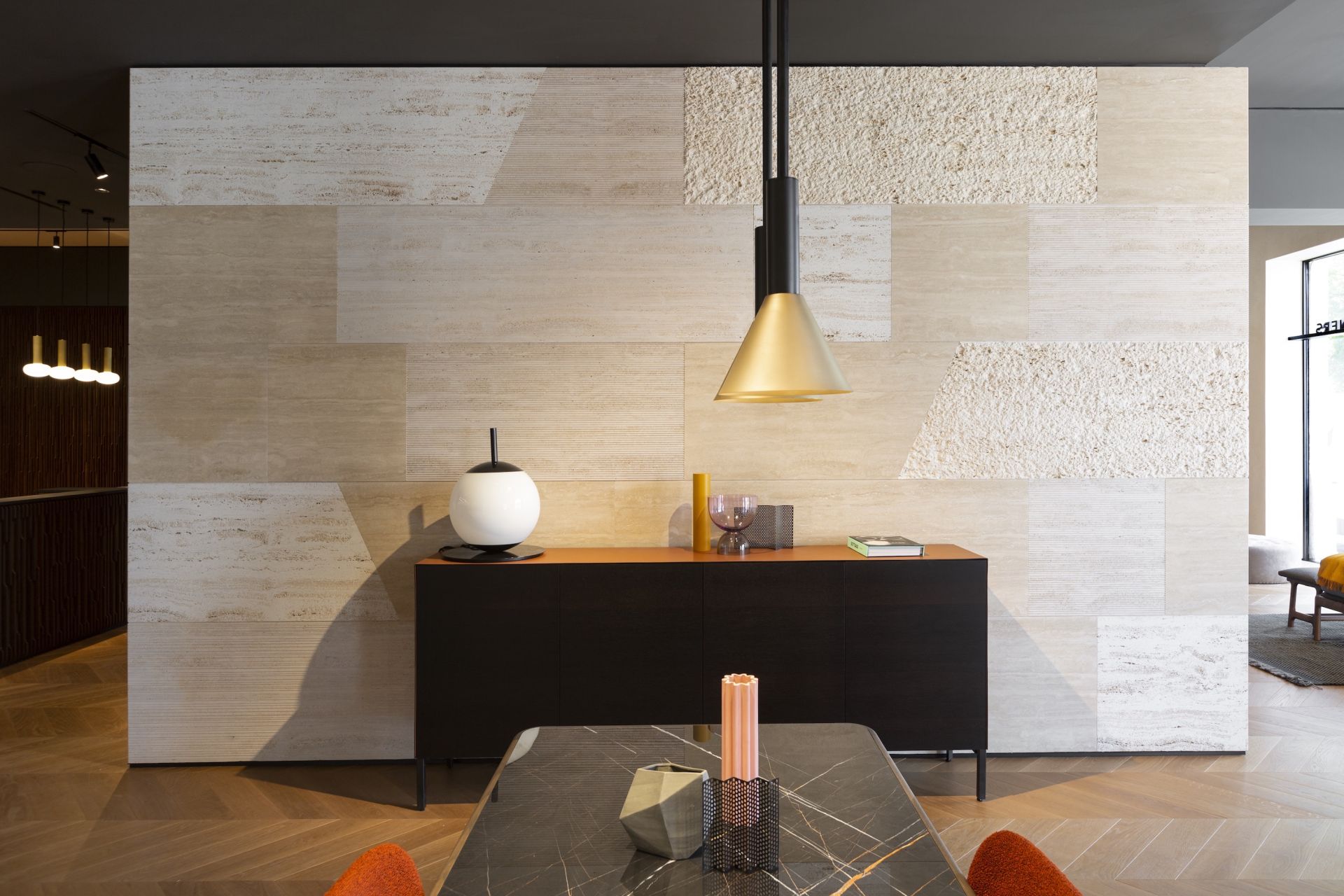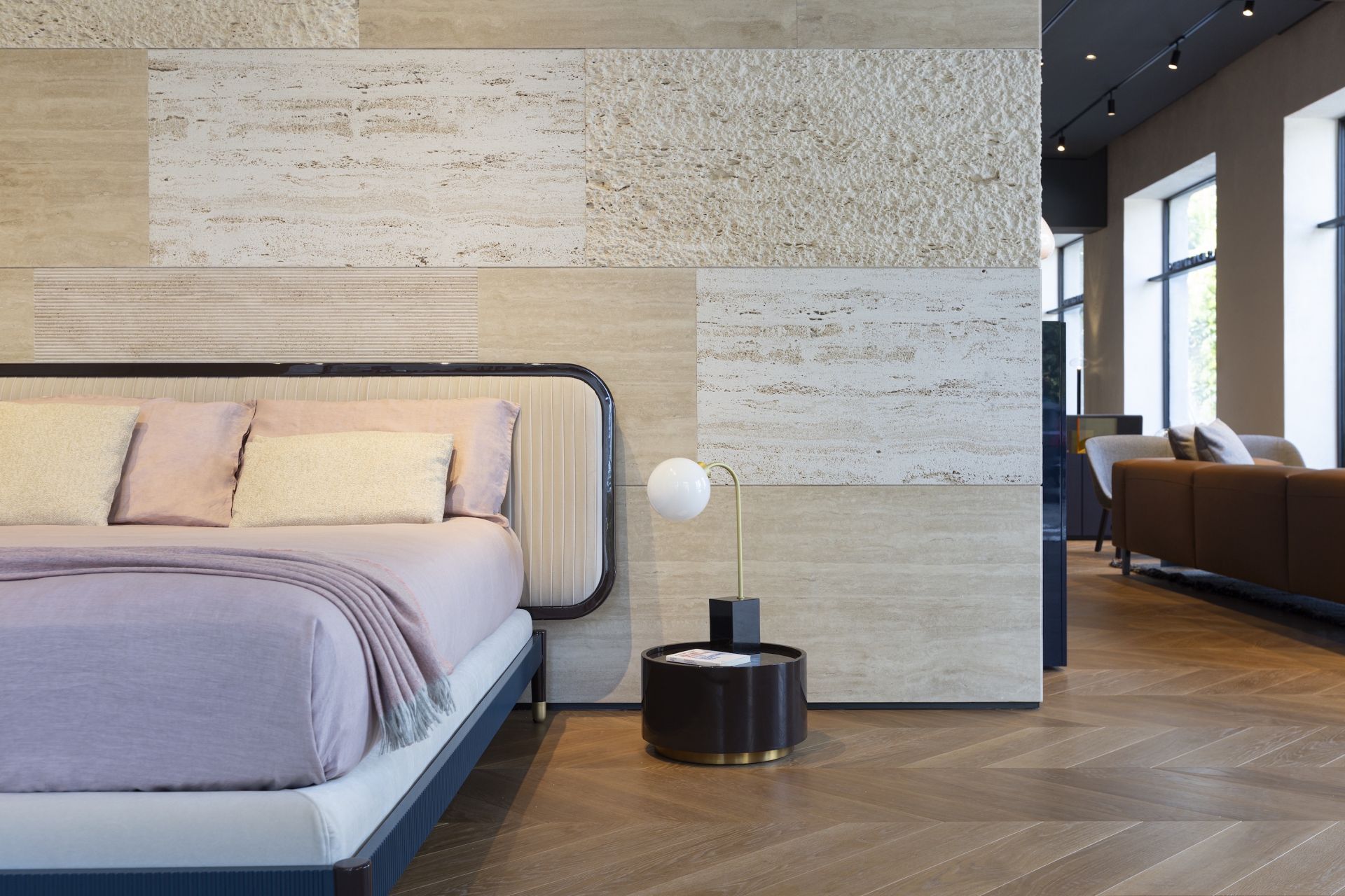 “我们采取了双重战略。一方面,我们为每个品牌选择了最有趣的产品,另一方面,我们力求赋予室内设计强烈的个性。”Paolo Brambilla 表示:“我们希望在空间的组织上有一个清晰的设计,这将使环境具有自己的特色,独立于展示的周期性变化。因此,我们引入了一些非常独特的建筑元素:六块石头分隔墙,可以帮助您阅读空间并识别穿过它的路径。这些墙还具有示范性的、几乎是说教的功能。它们完全由石灰华制成,但有五种不同的饰面,以强调相同的材料如何根据其饰面的不同而具有不同的感觉。”