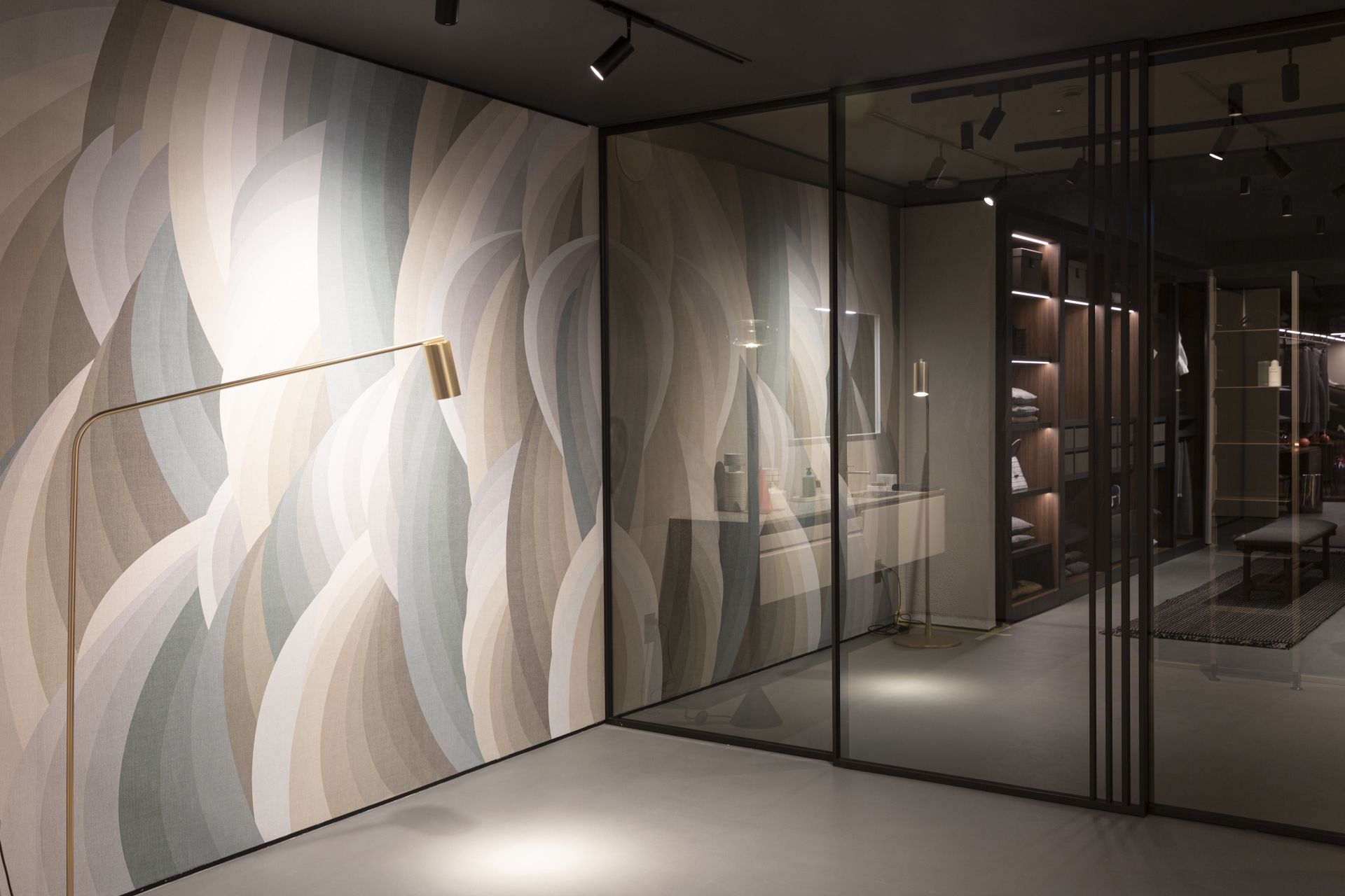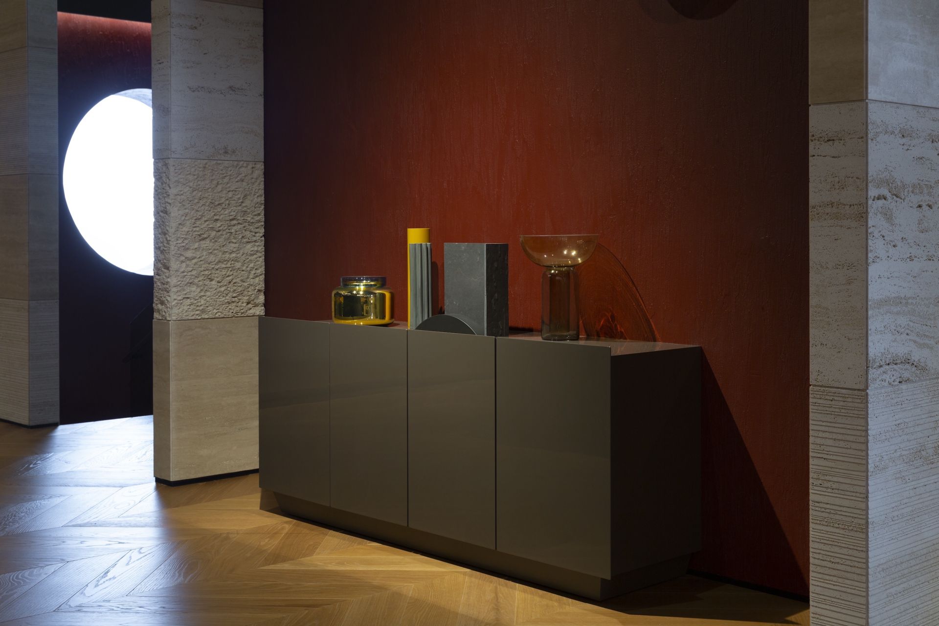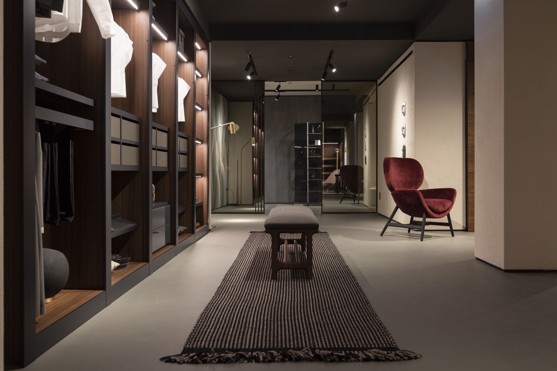 “我们采取了双重战略。一方面,我们为每个品牌选择了最有趣的产品,另一方面,我们力求赋予室内设计强烈的个性。”Paolo Brambilla 表示:“我们希望在空间的组织上有一个清晰的设计,这将使环境具有自己的特色,独立于展示的周期性变化。因此,我们引入了一些非常独特的建筑元素:六块石头分隔墙,可以帮助您阅读空间并识别穿过它的路径。这些墙还具有示范性的、几乎是说教的功能。它们完全由石灰华制成,但有五种不同的饰面,以强调相同的材料如何根据其饰面的不同而具有不同的感觉。”