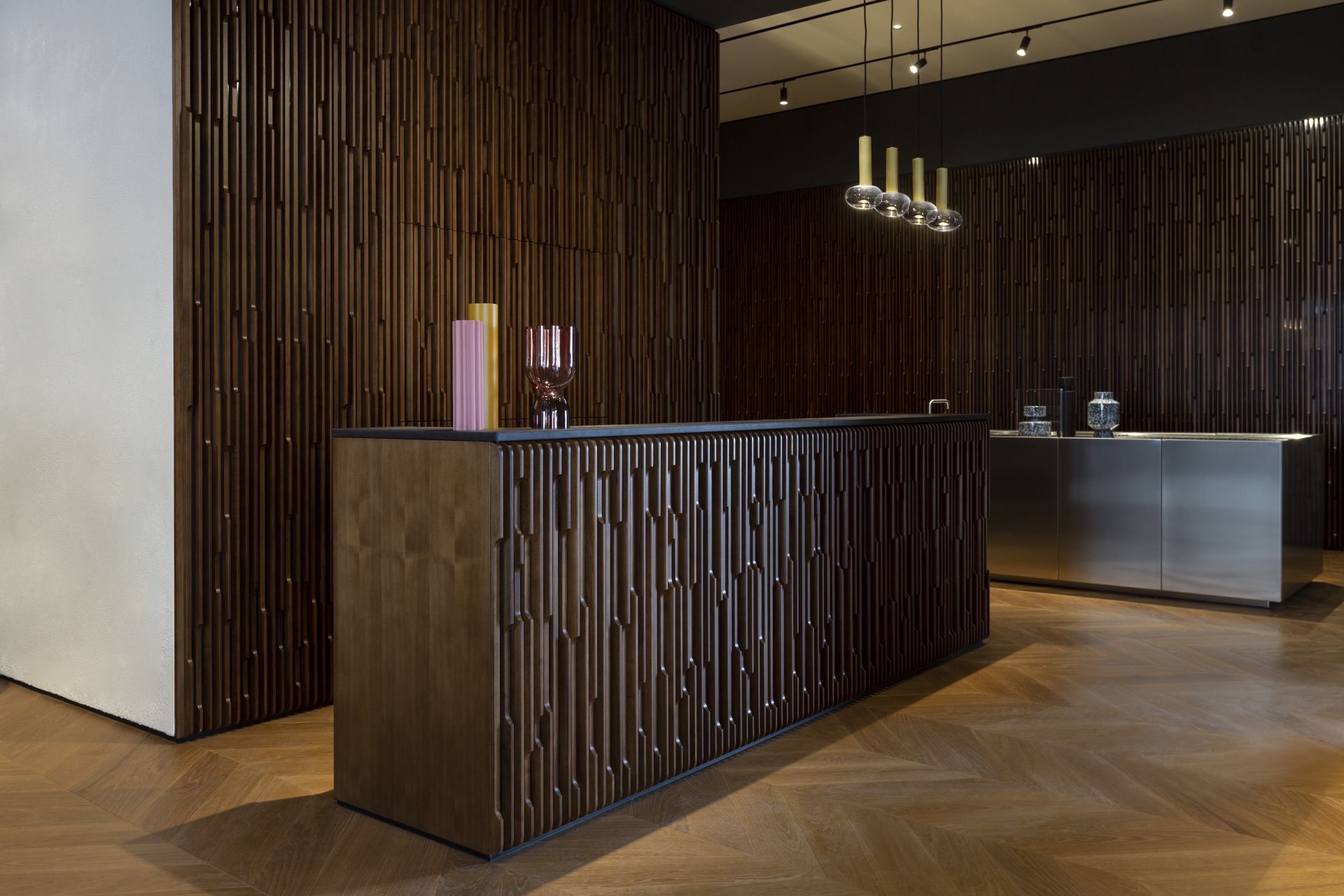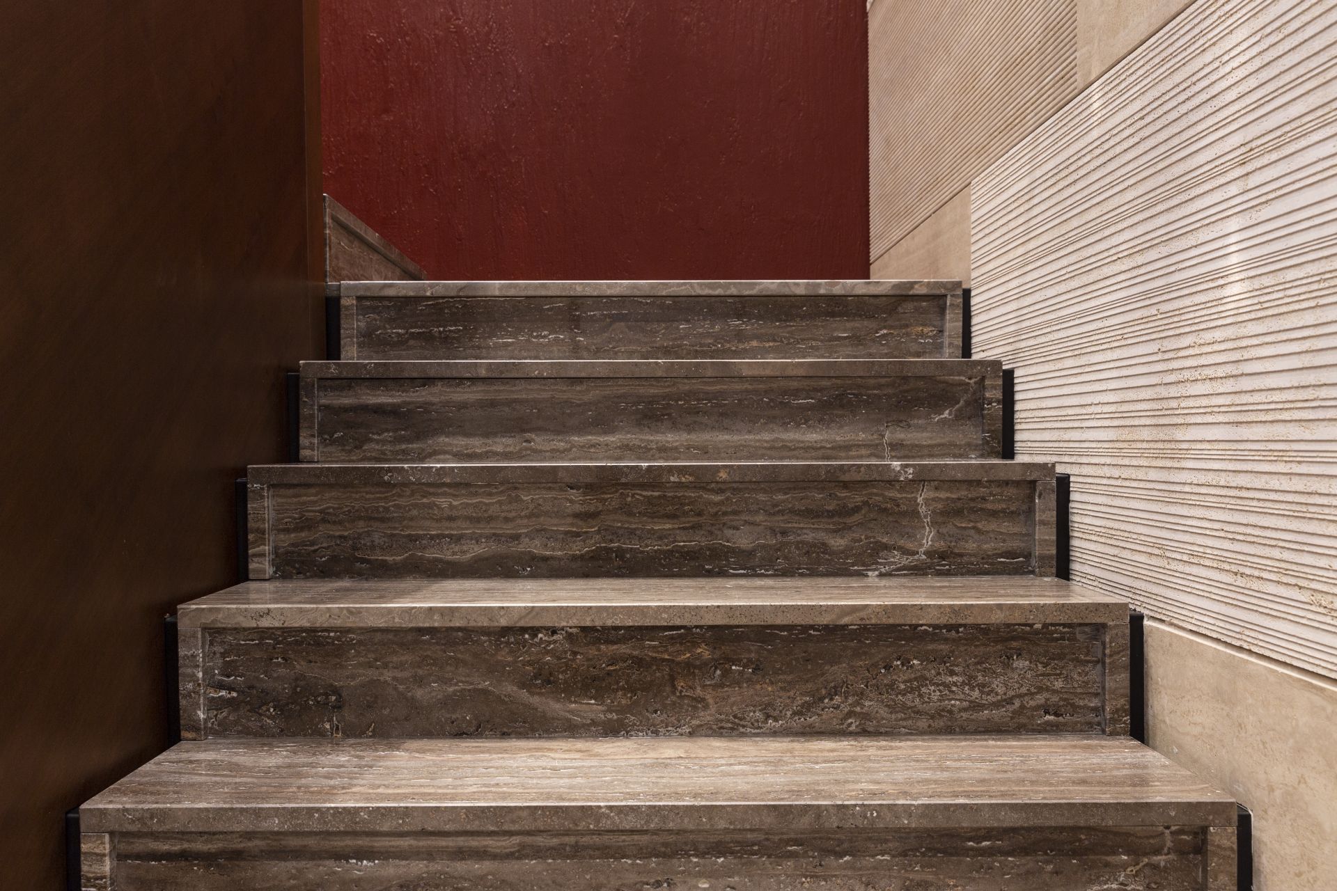 底层的色调围绕着石灰华和塔巴斯科红的温暖色调,与人字形拉丝橡木地板相结合。墙壁覆盖有纹理特别粗的树脂,与木板插入物交替,旨在展示各个合作伙伴的非凡工艺。