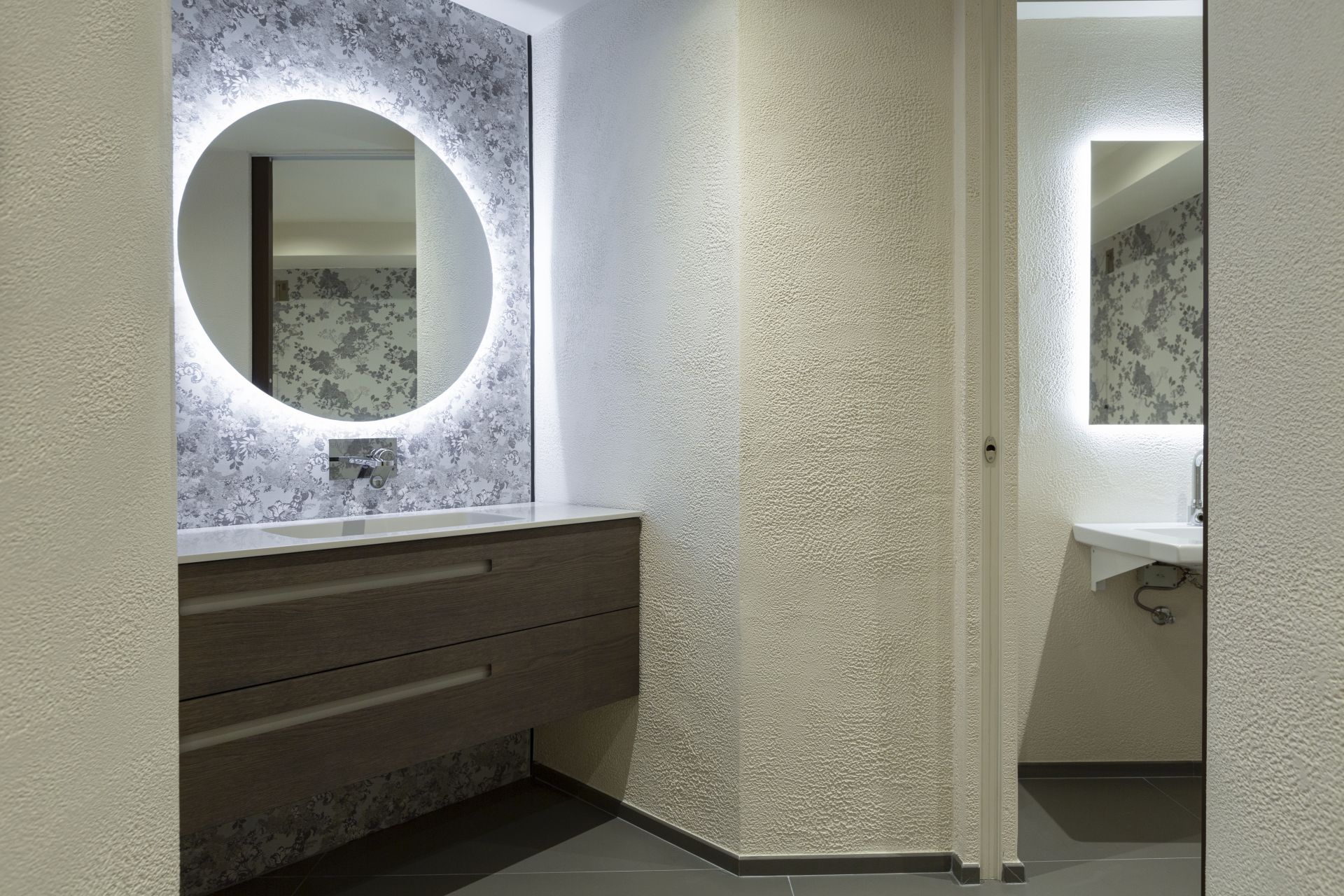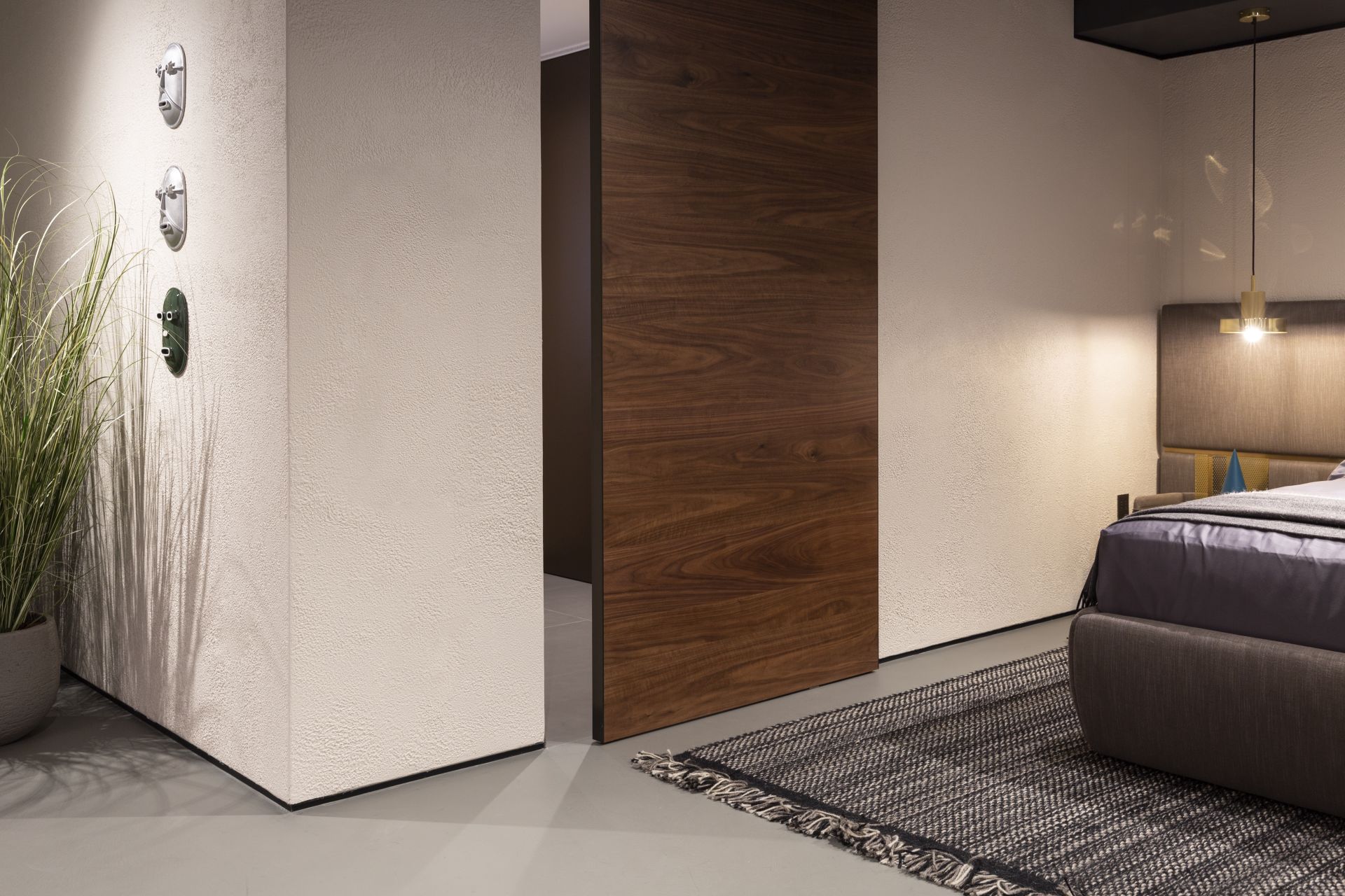 地下室层地板采用灰绿色树脂制成,搭配灰色和粉红色的垂直表面,并采用瓷砖和织物镶嵌物进行挑选。卧室区展示了 Pianca 一些最重要的衣柜和步入式衣柜系统,健康区旁边展示着专门从事浴室和水疗领域的合作伙伴的产品。