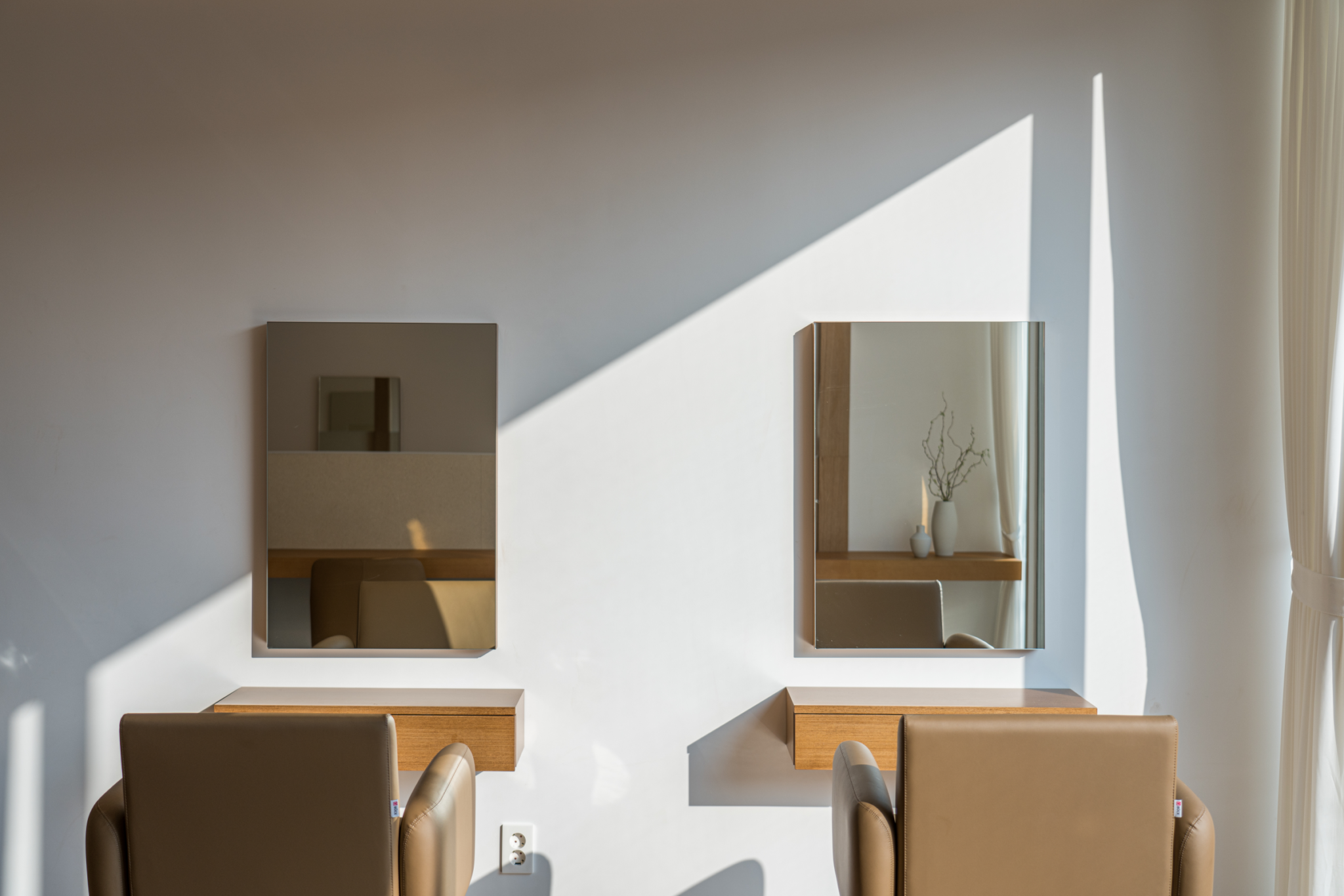 我们选择部分降低现有场地 4 米的高天花板高度。于是,在刻意低矮的等候空间中,一次性布置了建筑本身能够接收到的冷静、文书的形象,然后在面向的空间中遇到了山墙形式的阁楼形象。