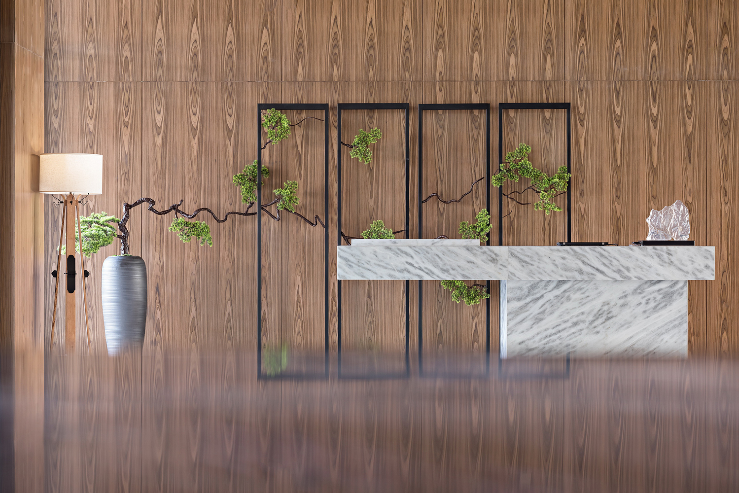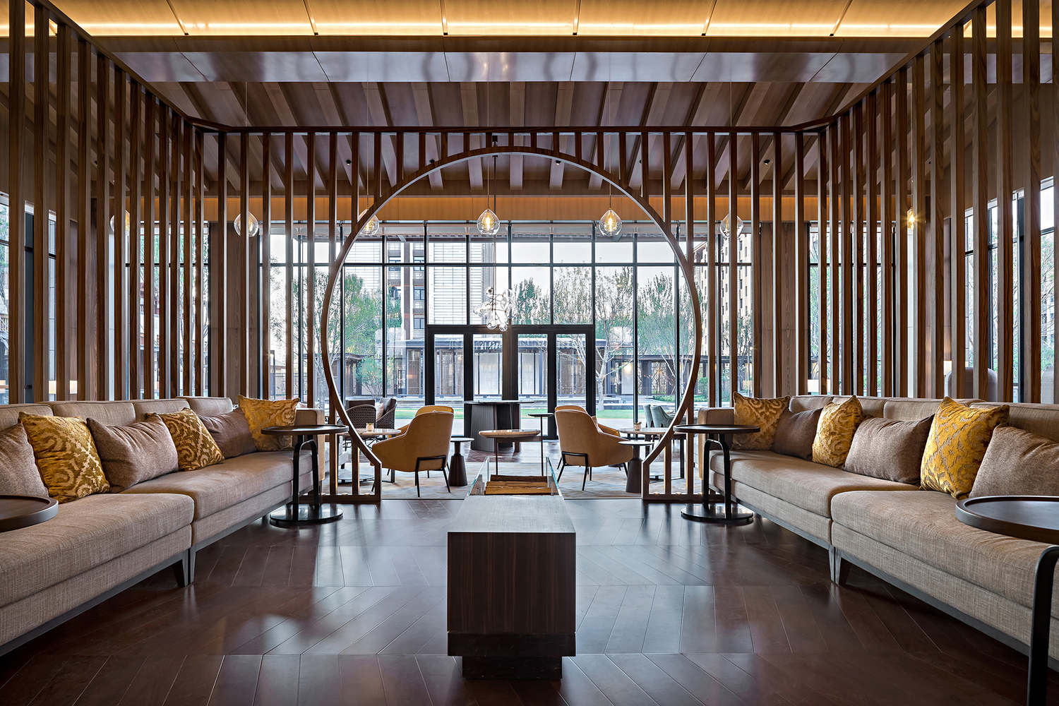 大堂设计灵感源自八达岭的山地景观和长城。使用层层重叠的天然大理石大板和灯光效果,创造出无尽的山脉轮廓,作为接待处的背景。大堂中央悬浮着一座大型当代铜金属山体雕塑,雨滴玻璃,与地板上的深色天然石材装置艺术相呼应,成为整个大堂的焦点。