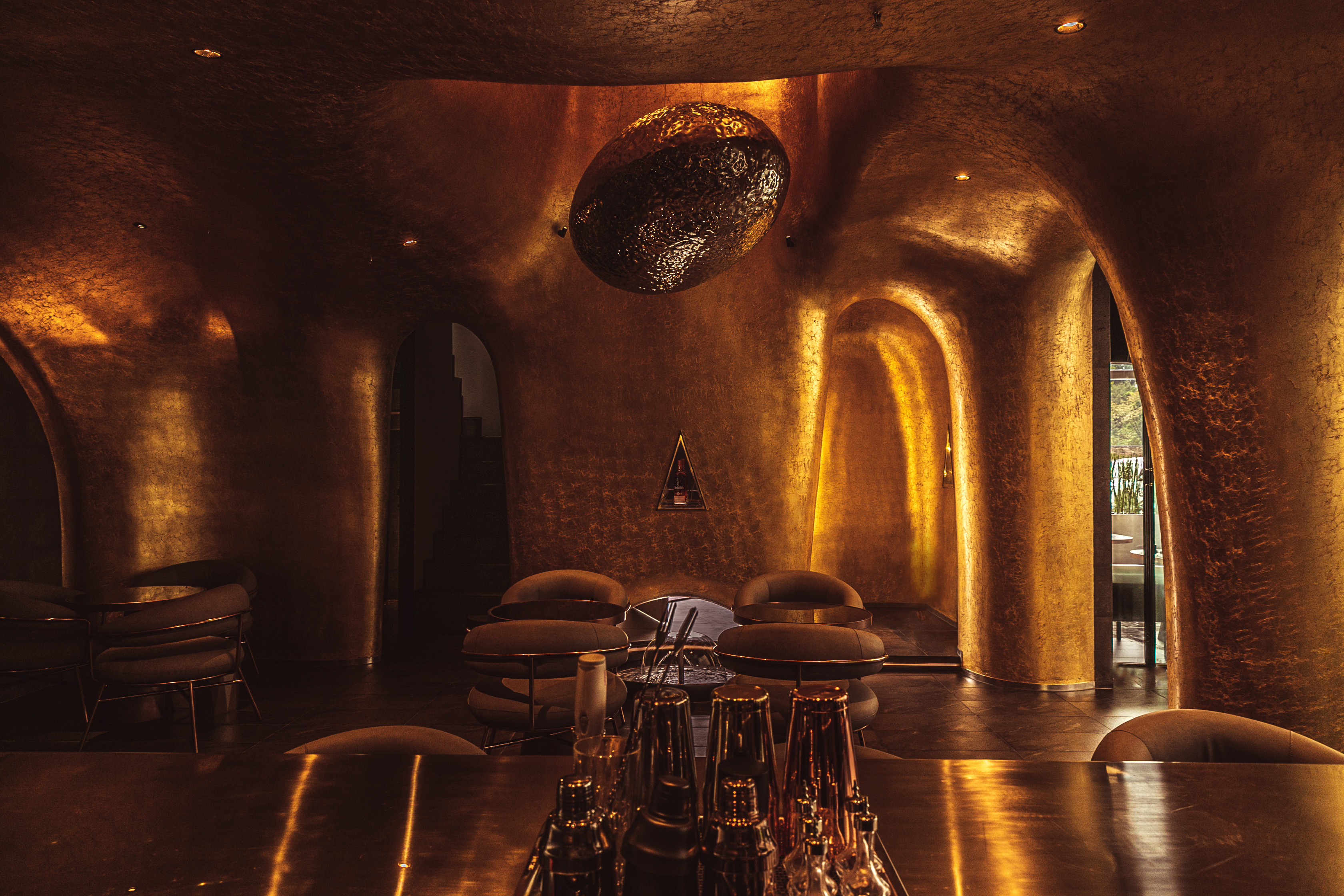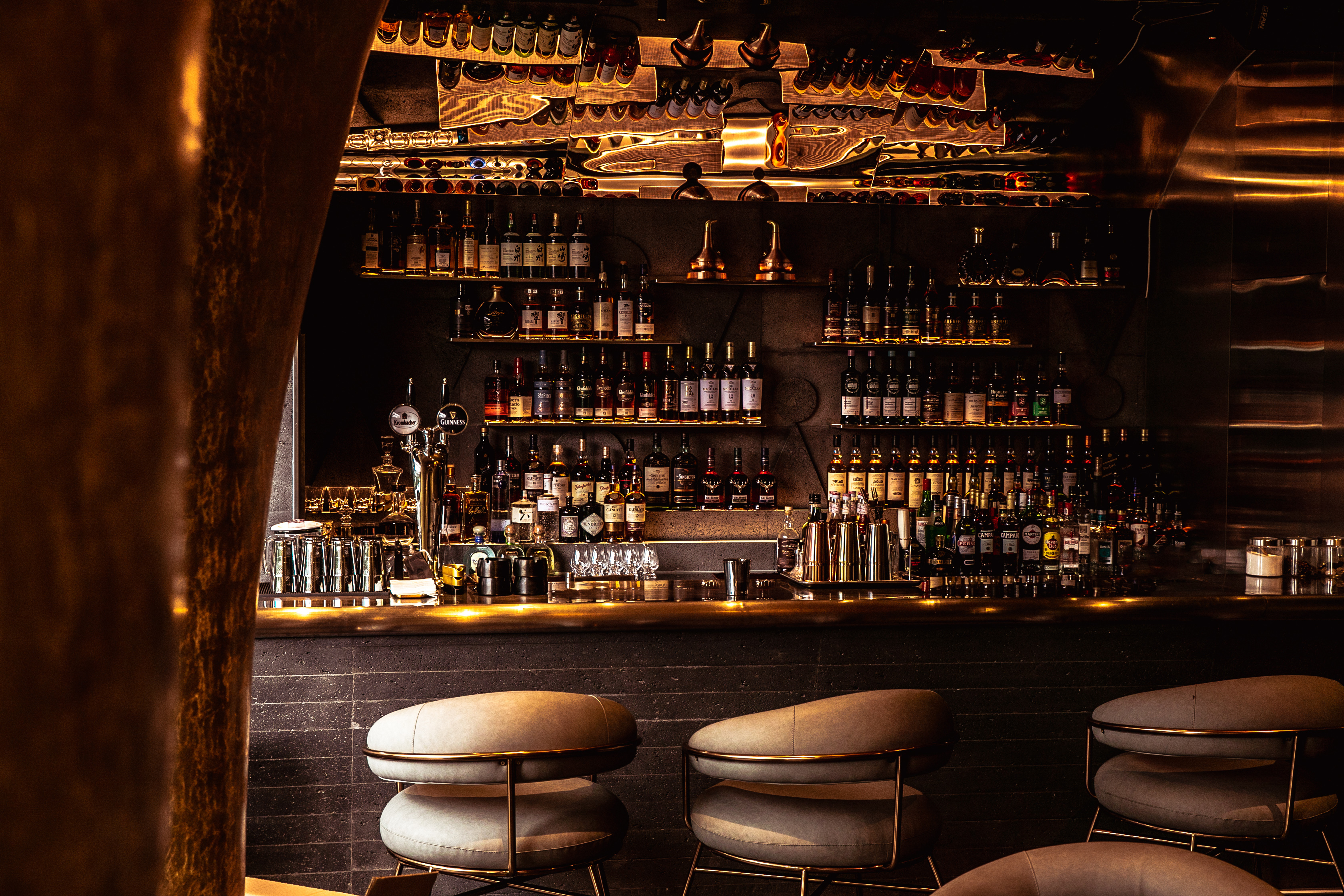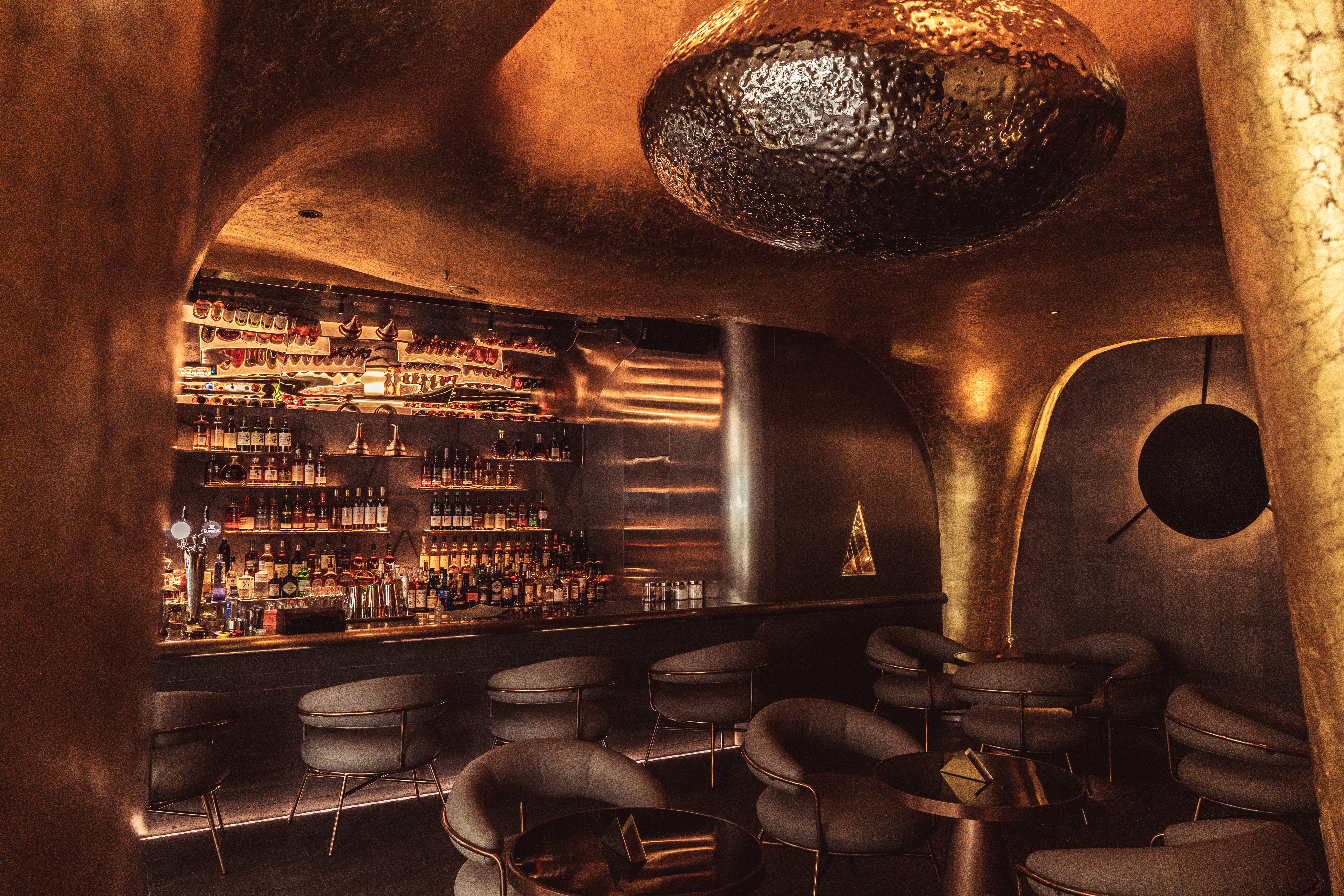 设计理念源自威士忌蒸馏器(COFFEY),在时间的流逝中通过蒸馏来分离物质。整个空间被视为一个蒸馏器,球形装置漂浮在容器内。它像一个冰球,一个水滴,在视觉上突破了传统空间的沉闷体验;忽视装饰,注重空间艺术。