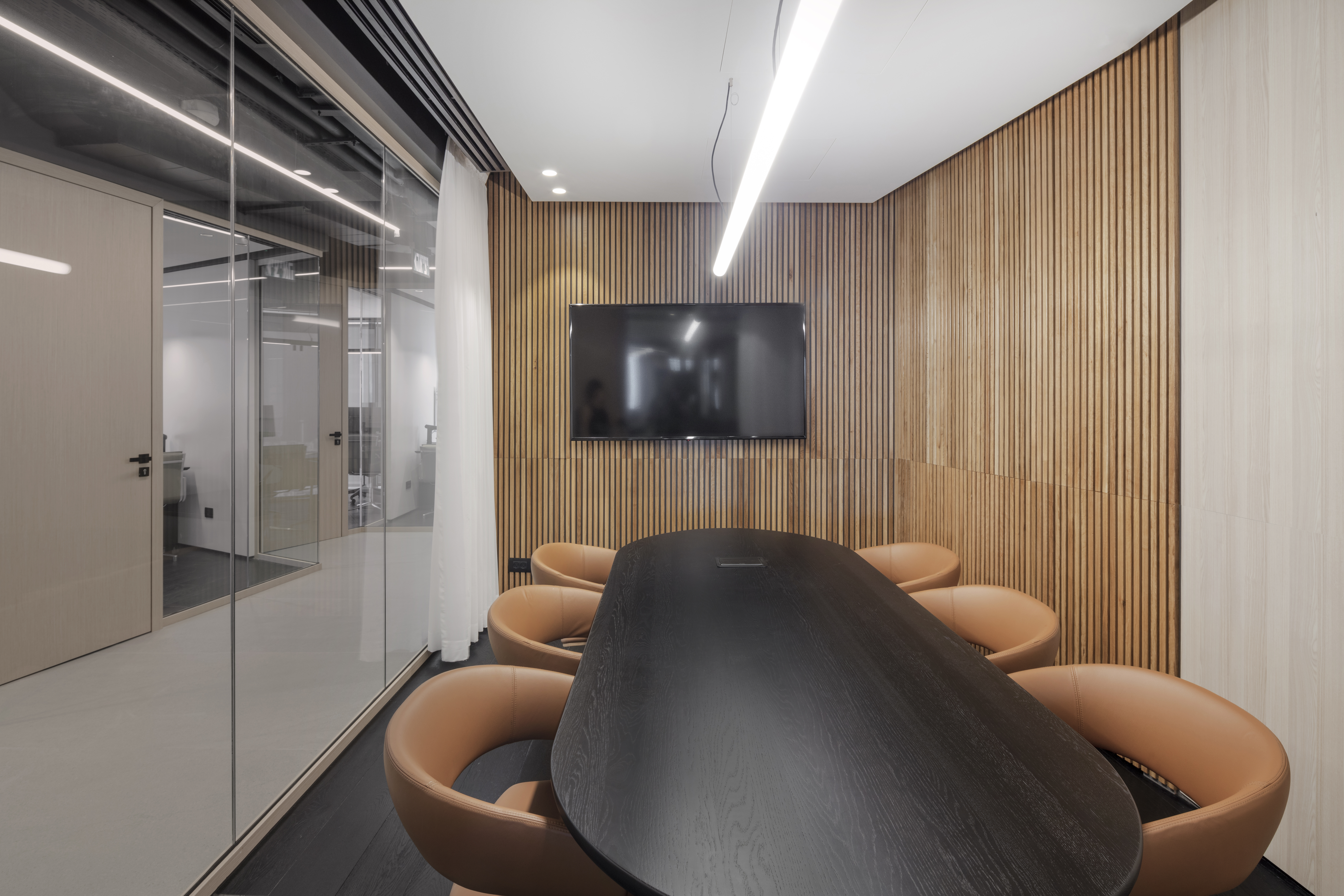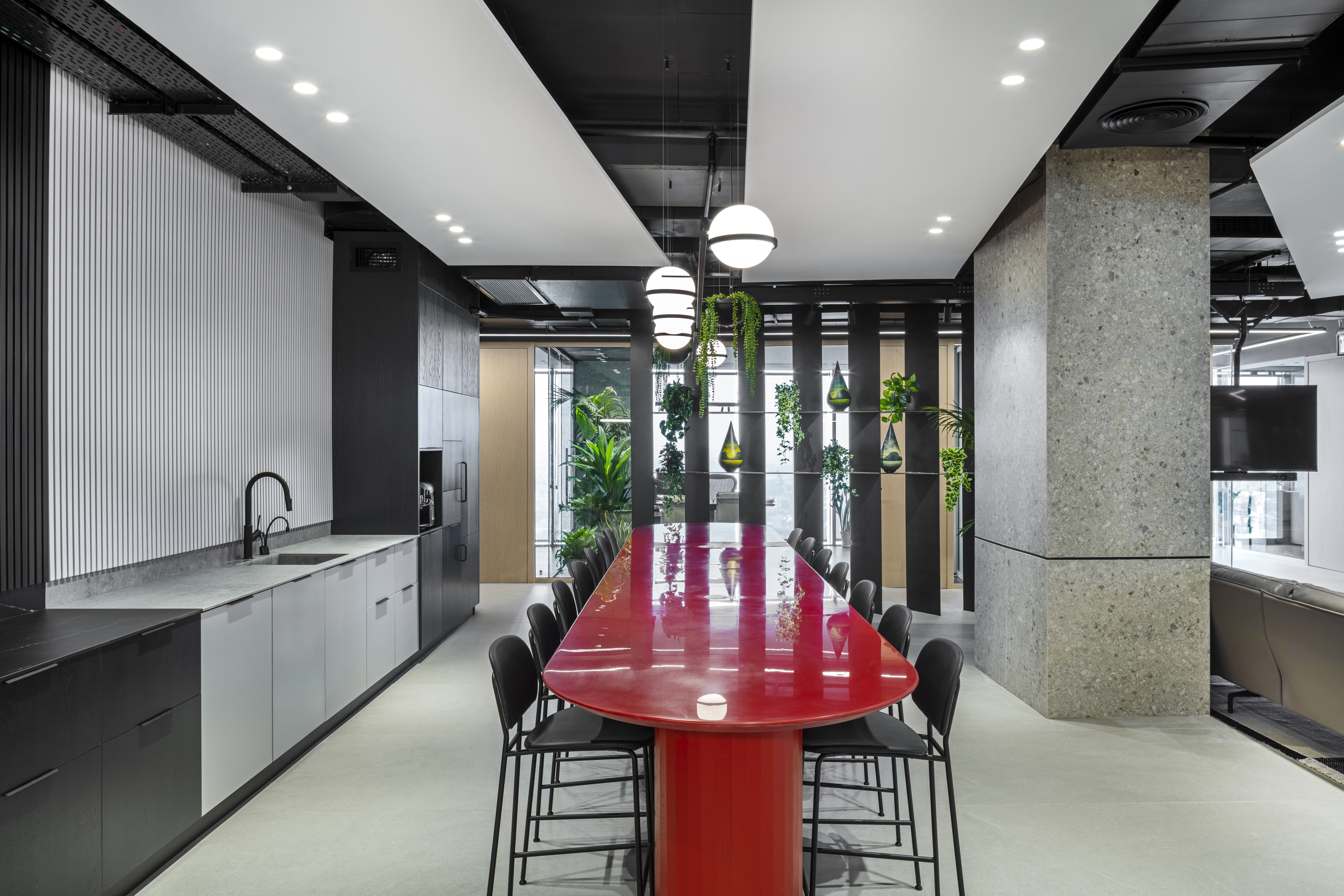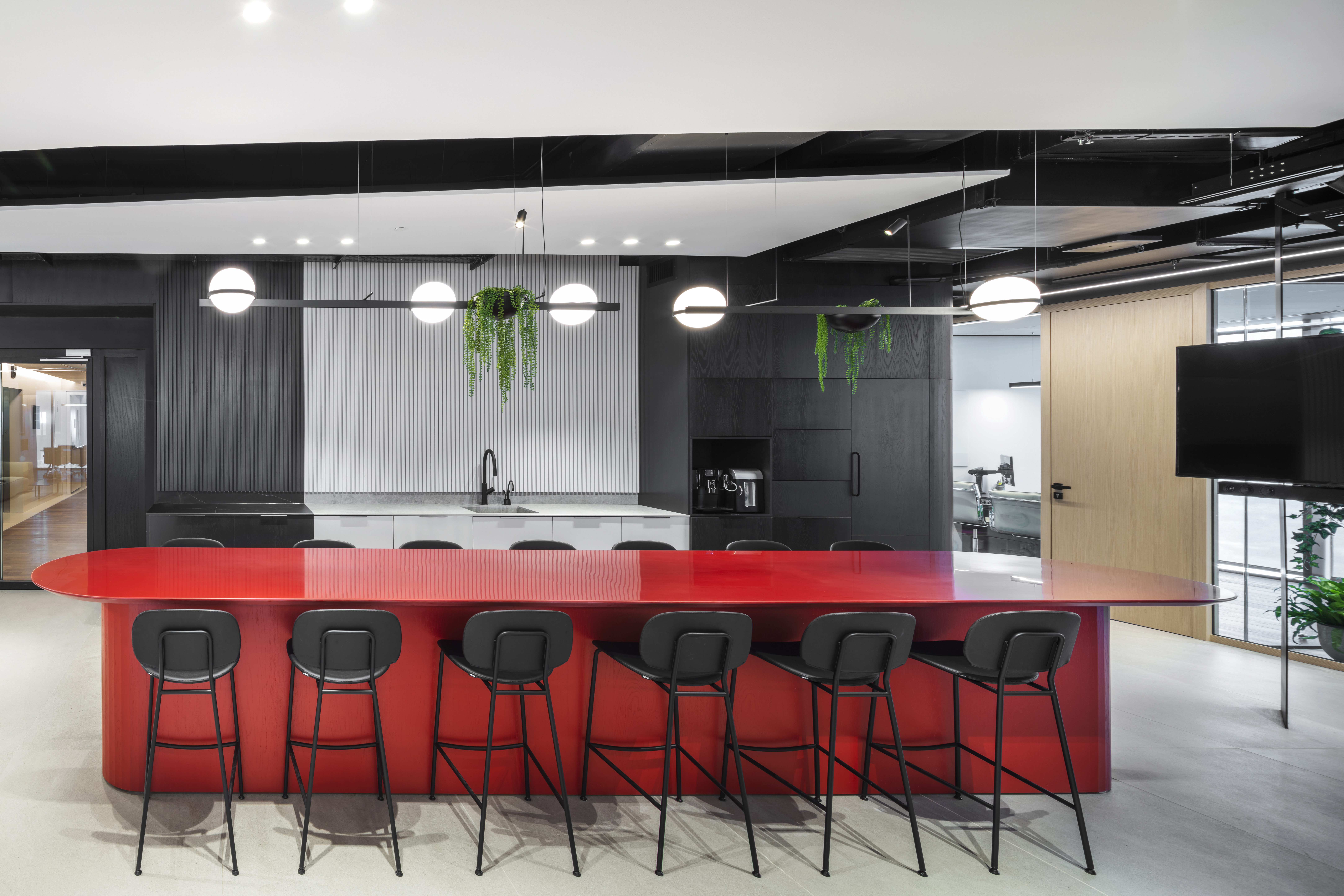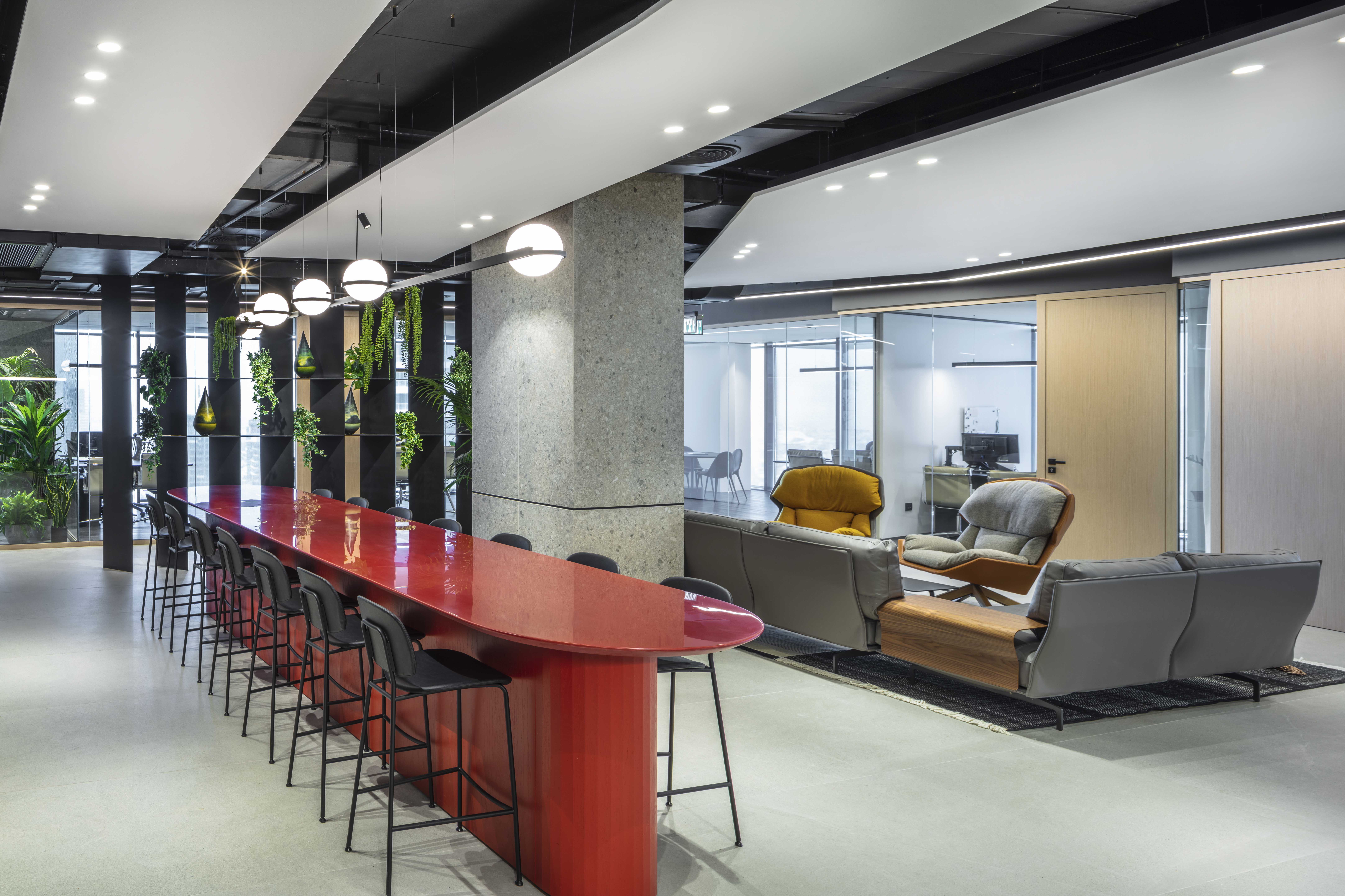 中央天花板设计有不同的独特几何形状 – 为了将它们安装在办公室中,我们必须从葡萄牙派遣一支专业团队,专门从事这种独特材料的工作。