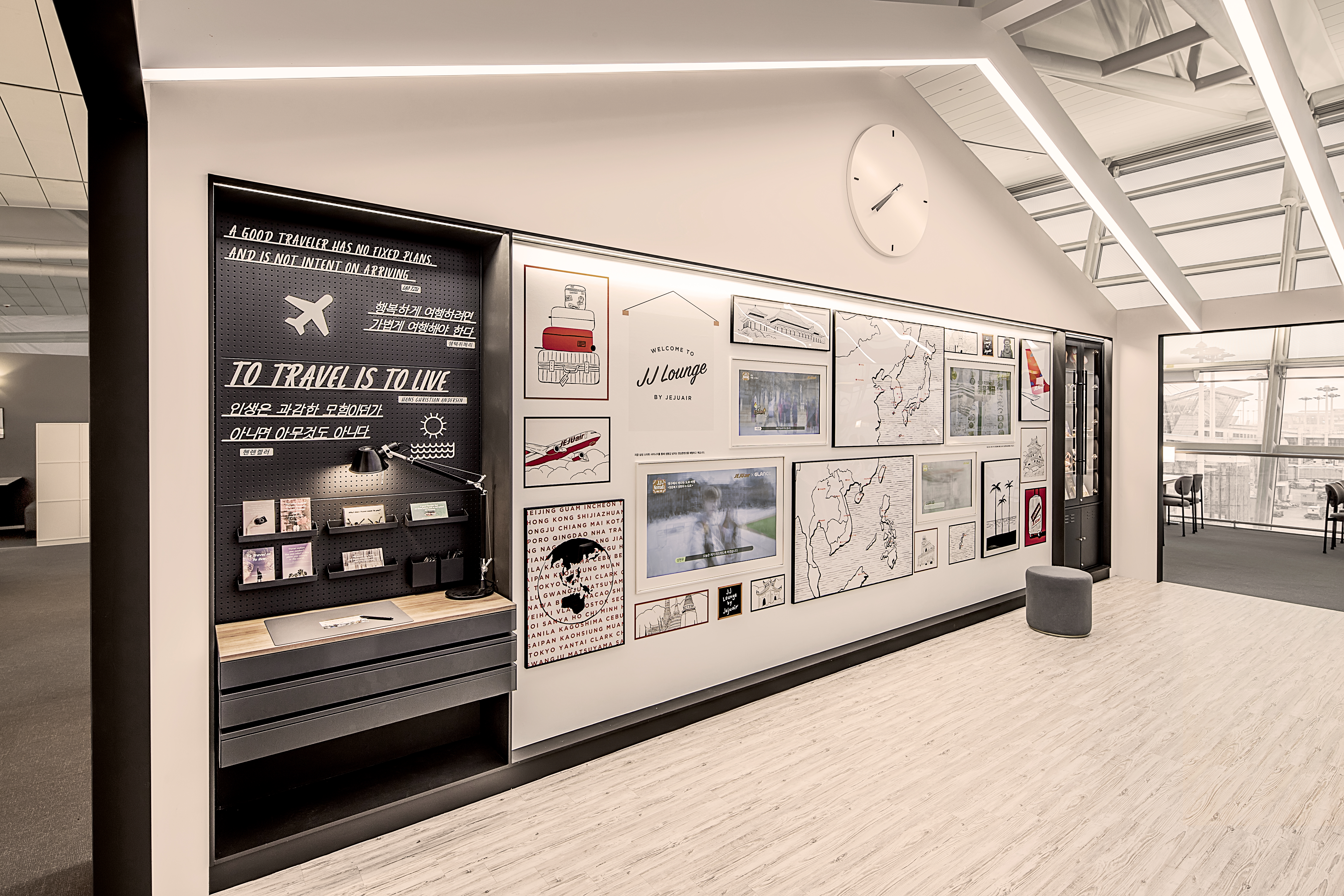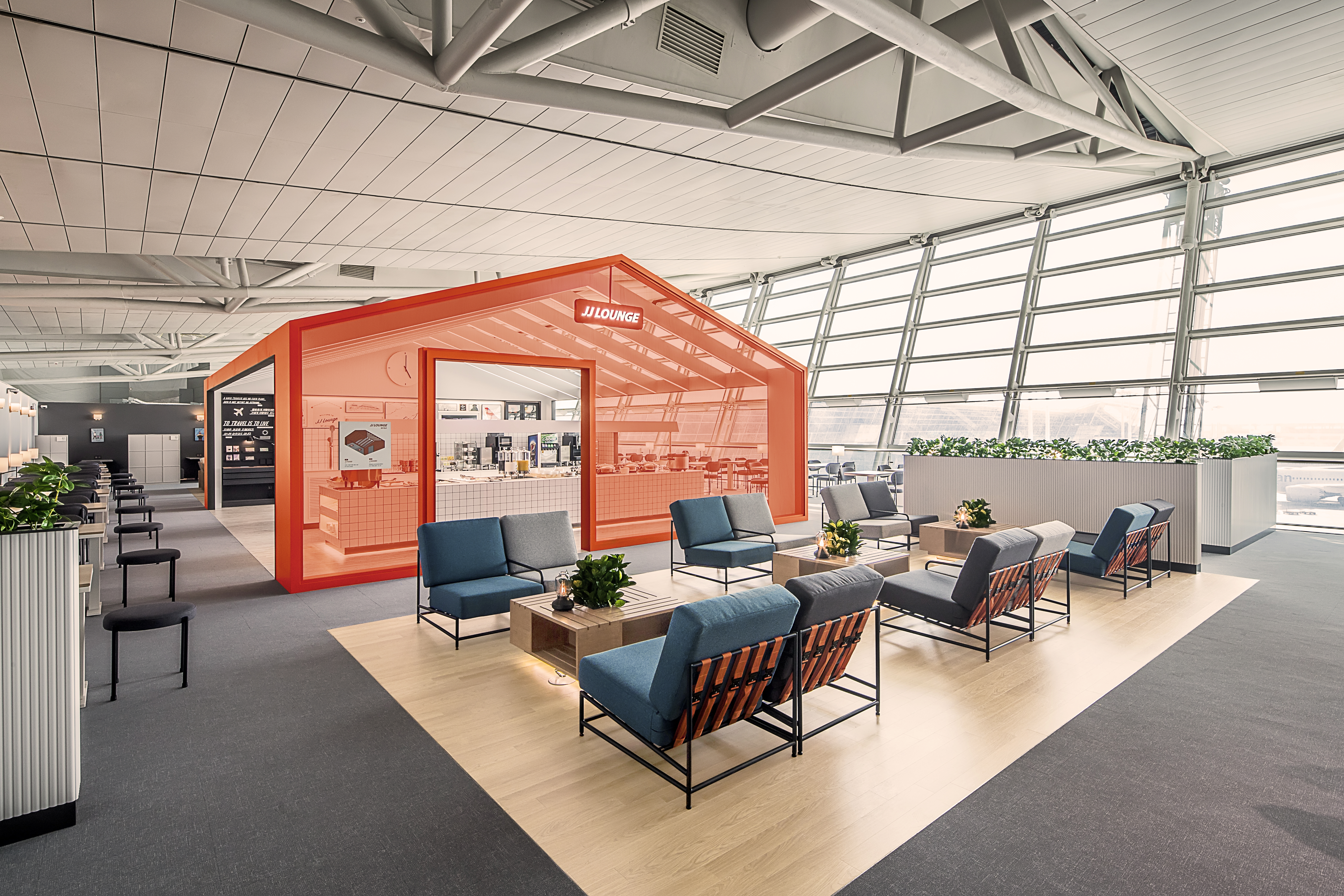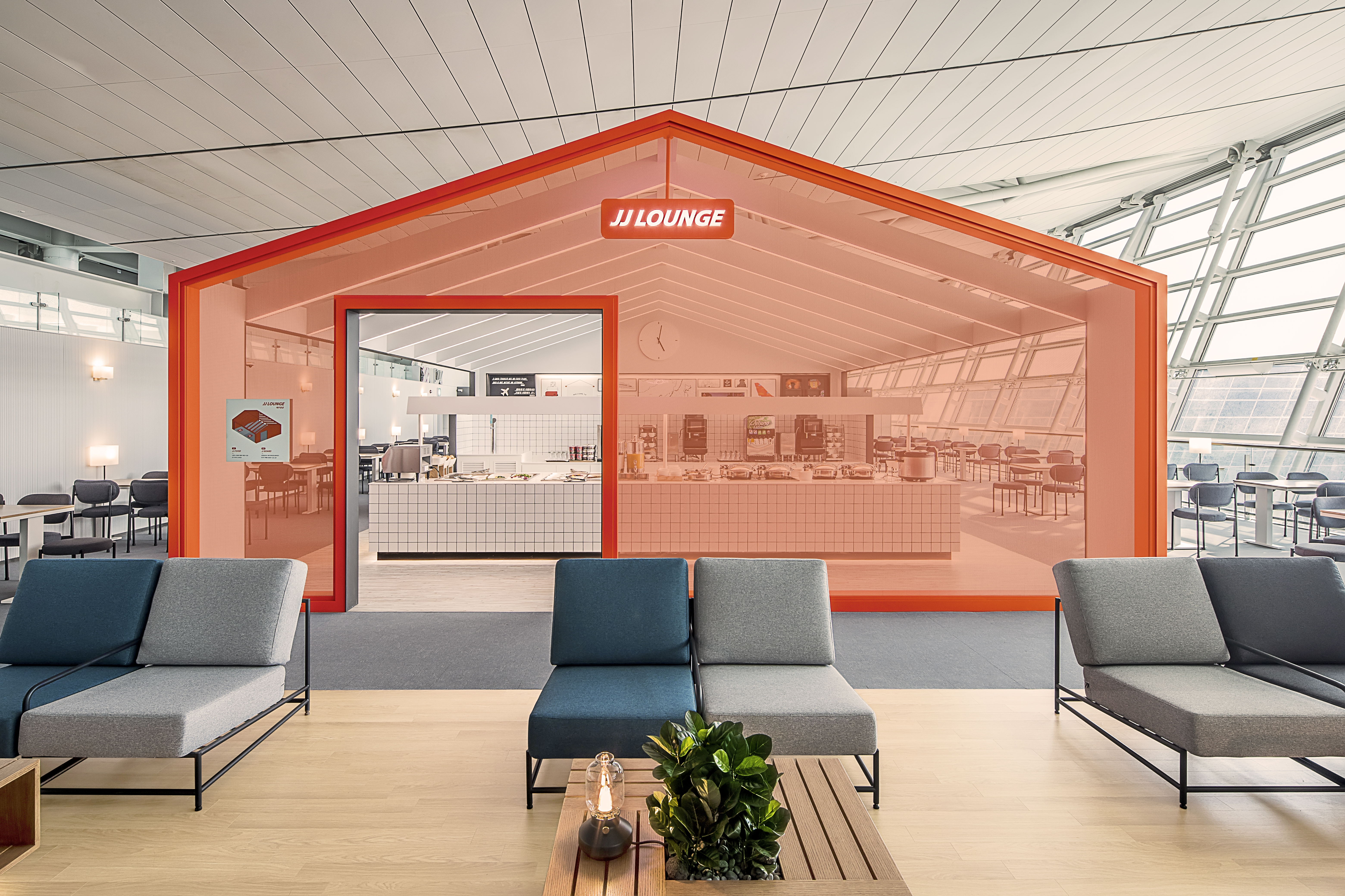 我们打造了“JJ’s Guest House”,让顾客获得新的旅行体验。我们通过使用济州航空的品牌颜色来强调这一概念。这个地方的设计看起来像一个宾馆,有院子、用餐区和客厅。我们希望顾客在这家舒适的宾馆中放松身心,分享旅行信息并与人交往。我们决定根据济州航空自身故事的旅行内容创建一个与客户沟通的开放平台。