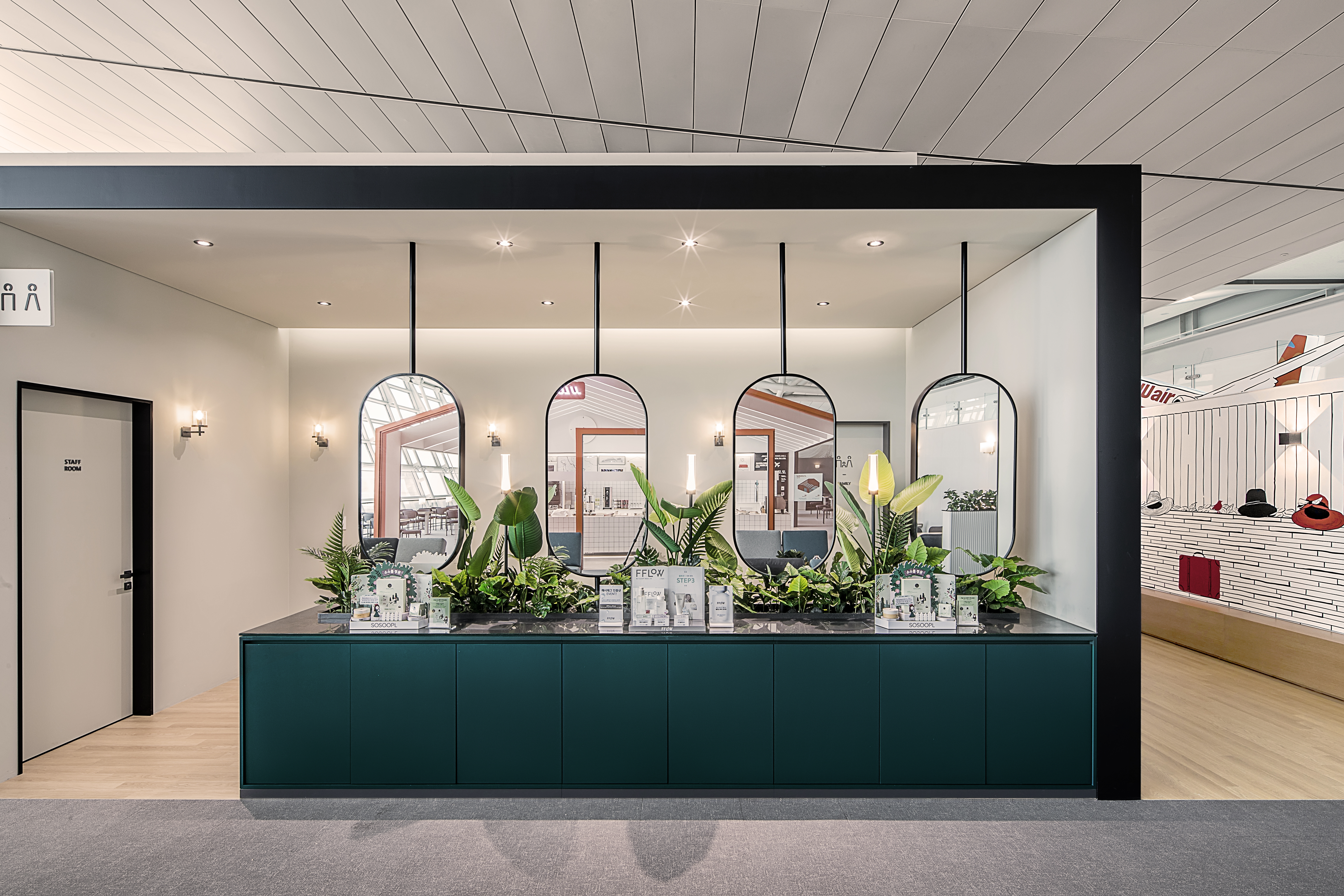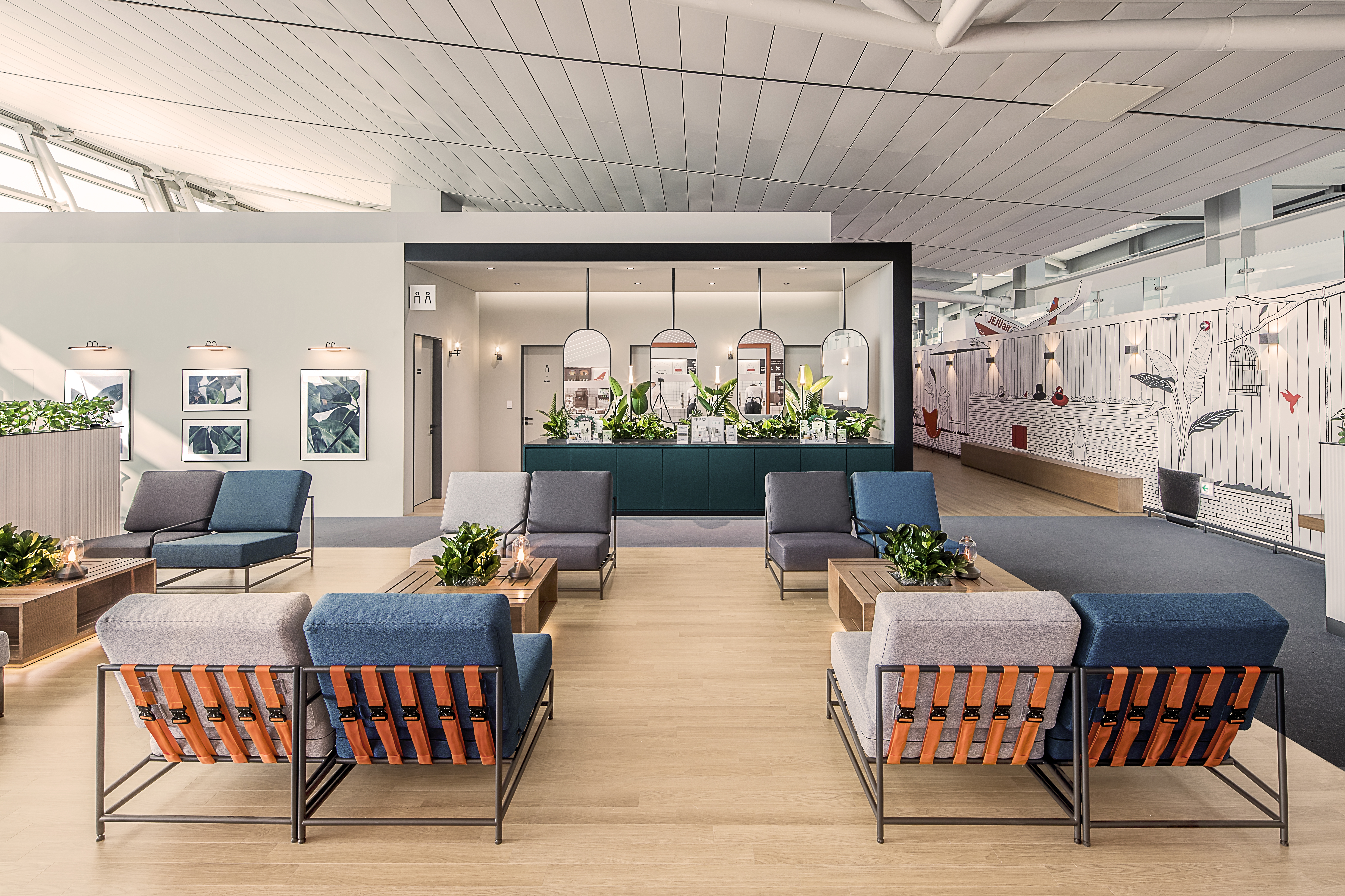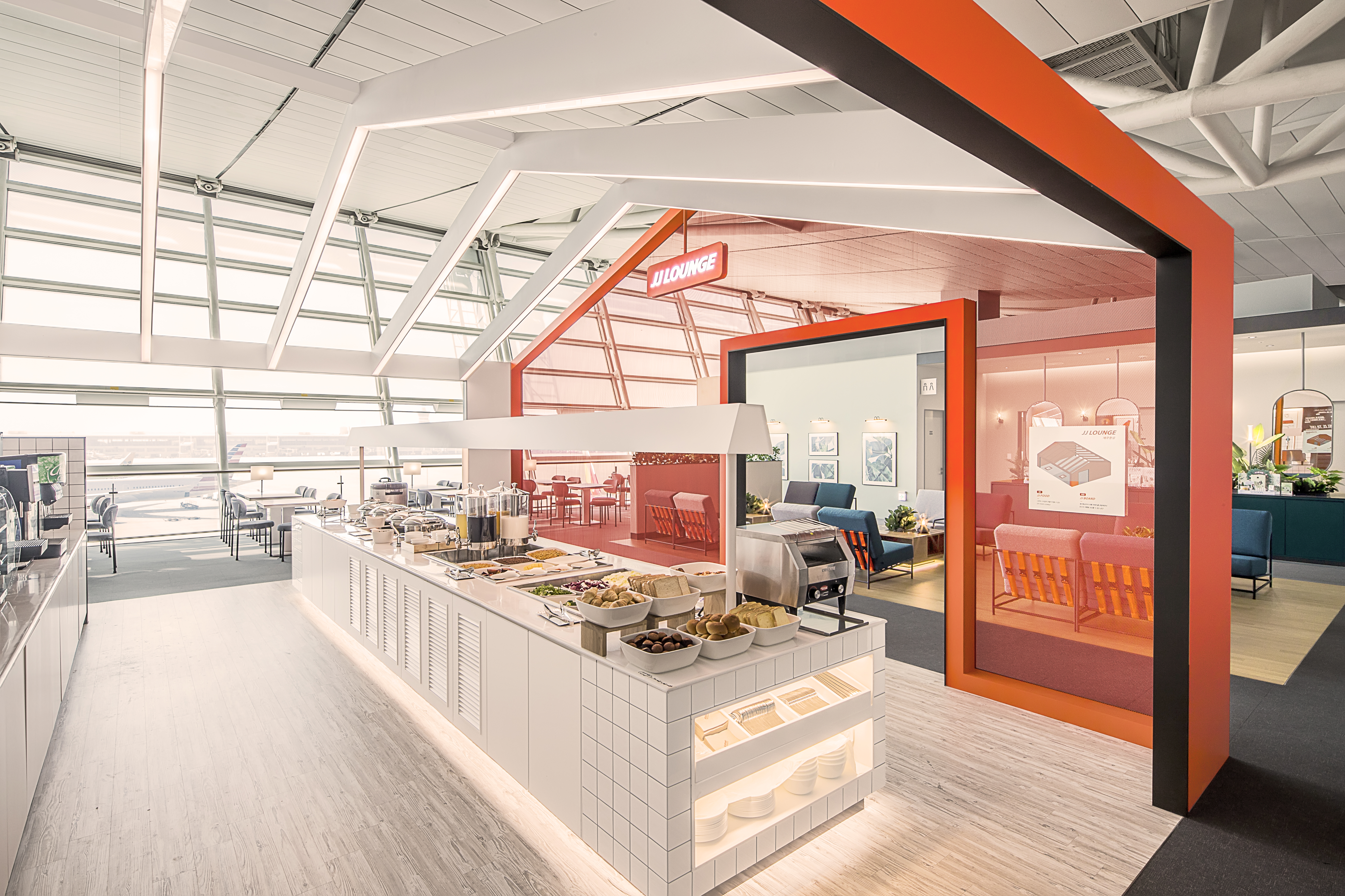 我们打造了“JJ’s Guest House”,让顾客获得新的旅行体验。我们通过使用济州航空的品牌颜色来强调这一概念。这个地方的设计看起来像一个宾馆,有院子、用餐区和客厅。我们希望顾客在这家舒适的宾馆中放松身心,分享旅行信息并与人交往。我们决定根据济州航空自身故事的旅行内容创建一个与客户沟通的开放平台。