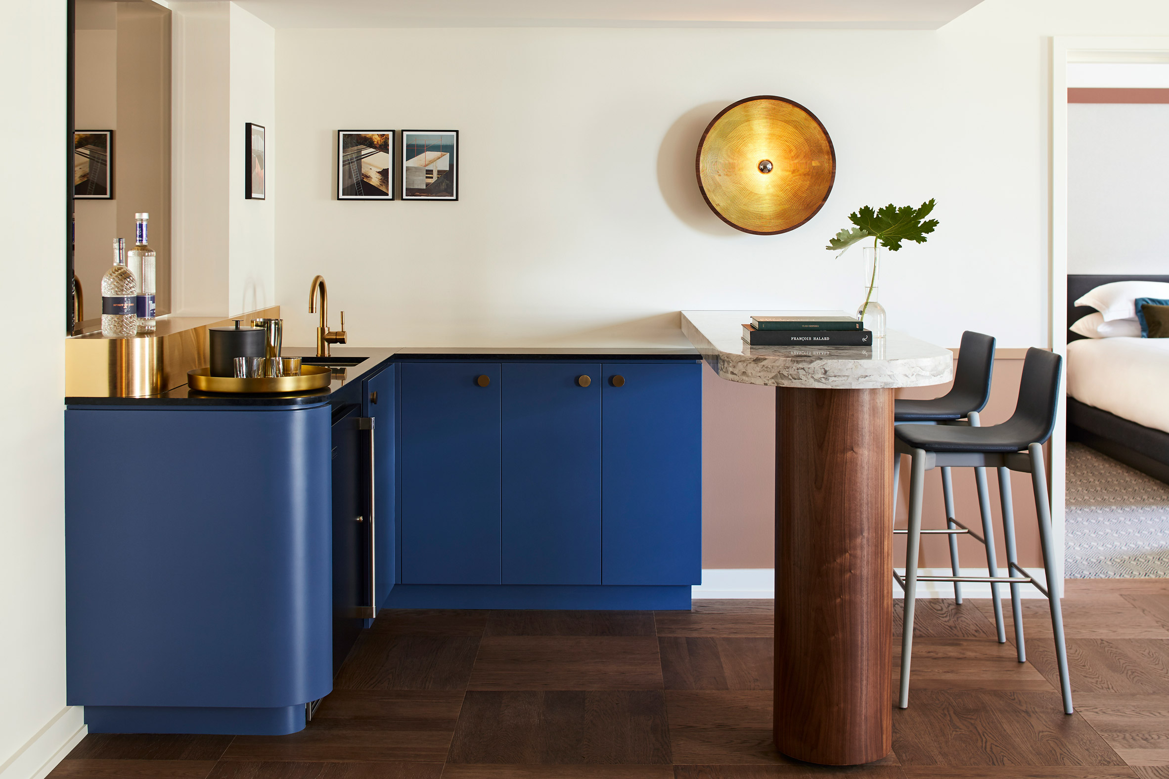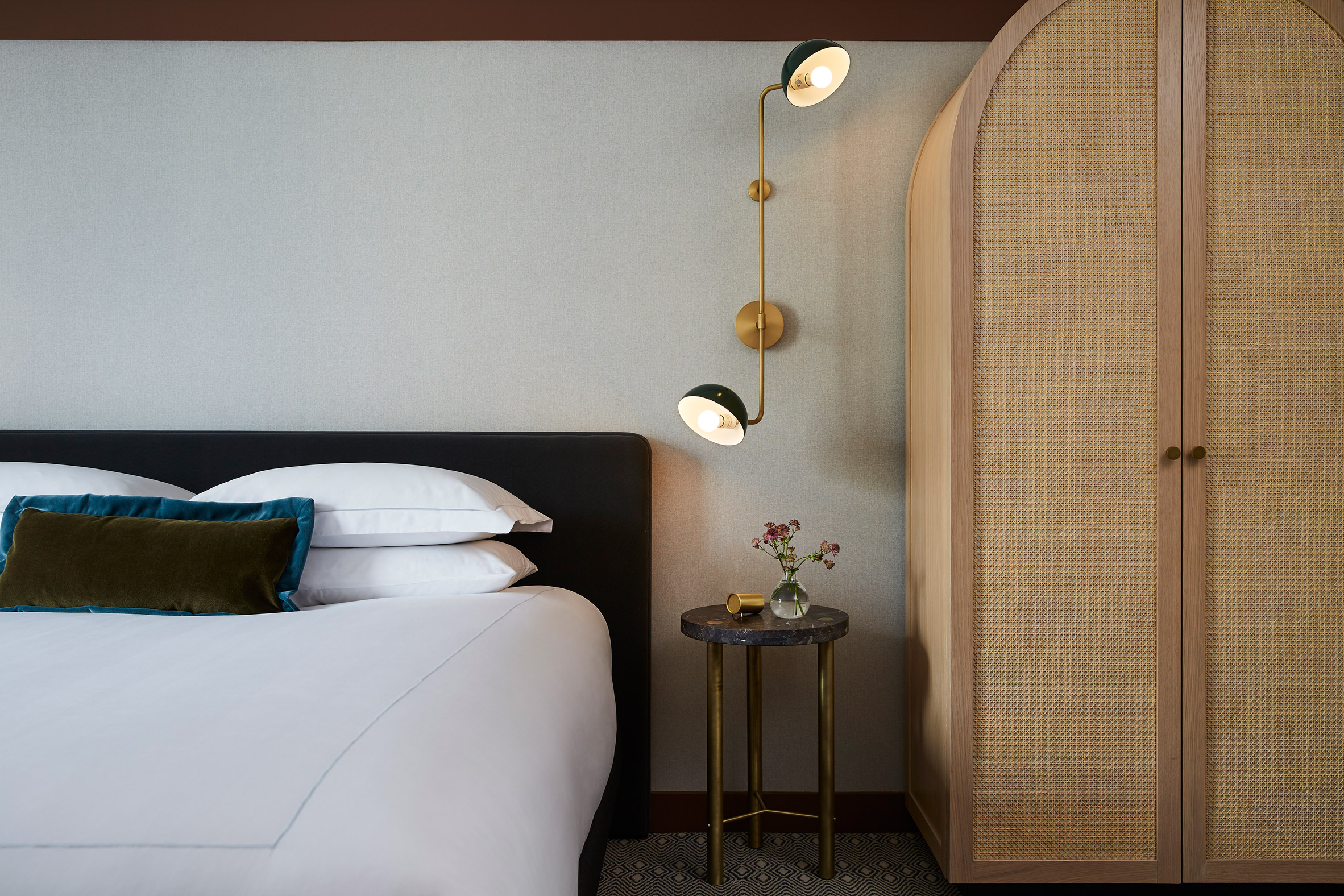 类似公寓的客房继续通过定制家具(其中许多是弯曲或圆形的)、加拿大黑胶唱片机和当地制作的装饰物品来传达多伦多文化和设计的故事。每个房间的橡木和藤条衣橱里都有一个由艺术二人组 Greatbeard 设计的白色树脂松鼠雕像——这是对这座城市著名的白化松鼠的俏皮致敬。