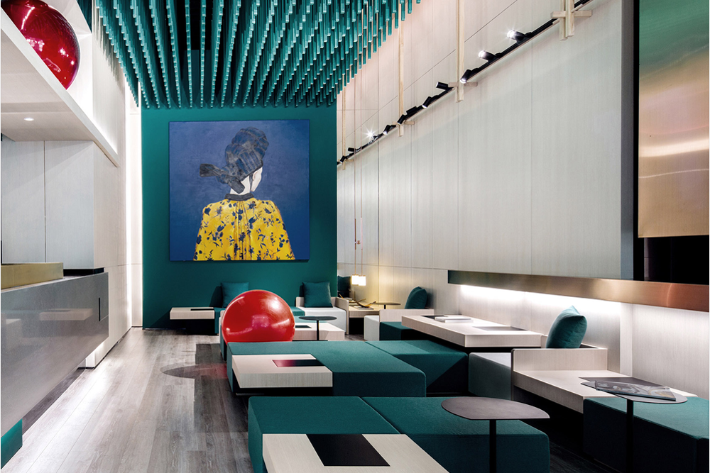 模块化家具包括脚凳、矮桌和钢制边桌。整个空间以翠绿色为主色调,显然参考了 Bense E Cha 提供的绿茶混合物。虽然一幅大型绘画暗示了茶的历史及其传统,但空间的设计和布置旨在唤起现代生活方式。桌椅密集排列,缩短了顾客之间的距离,使他们能够面对面坐着,促进彼此之间的互动和交流。订单从服务柜台分发,服务柜台完全由石头覆盖,并配有内置玻璃柜,位于主座位区的正对面。红色调的大型装饰球体增添了流行色彩。