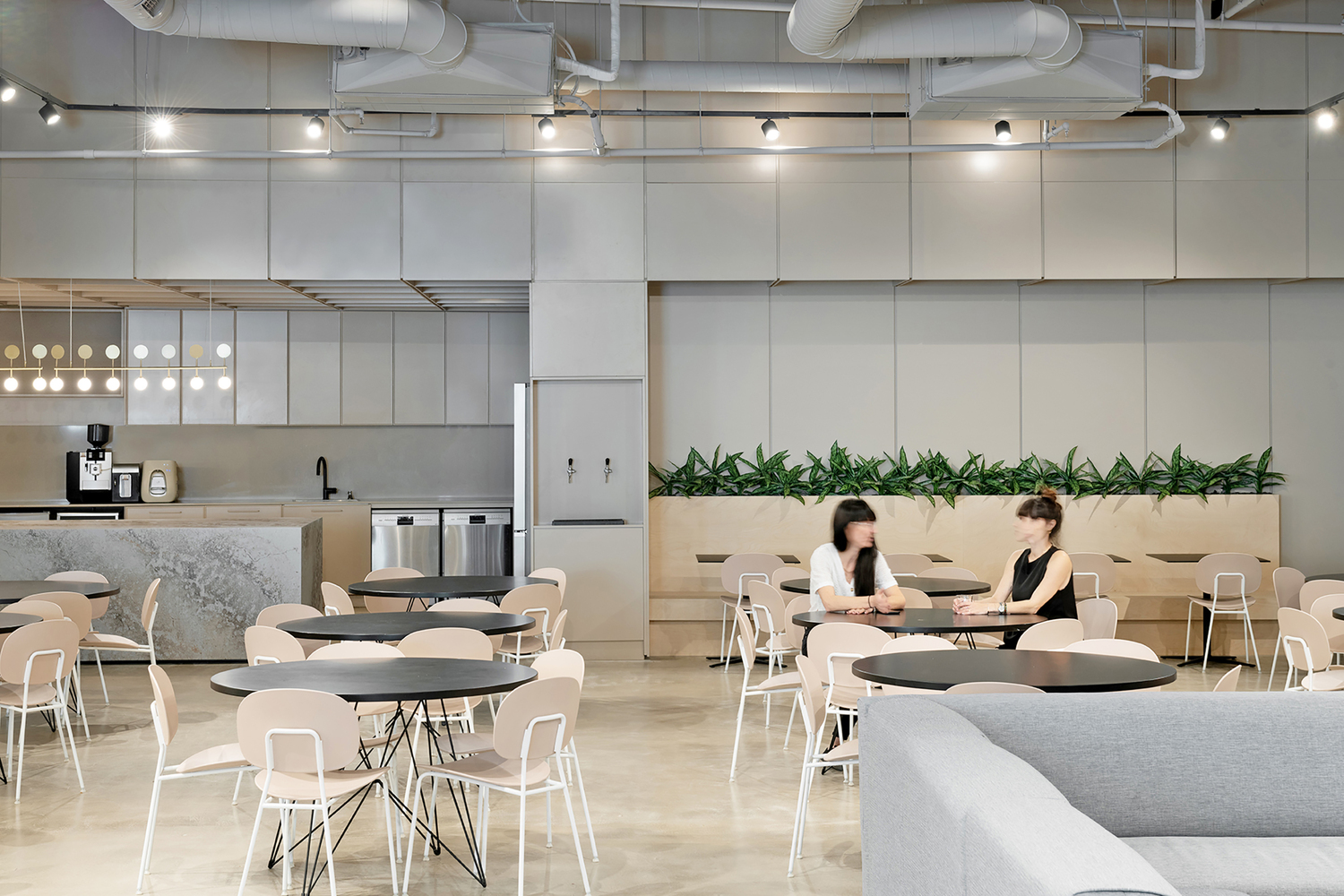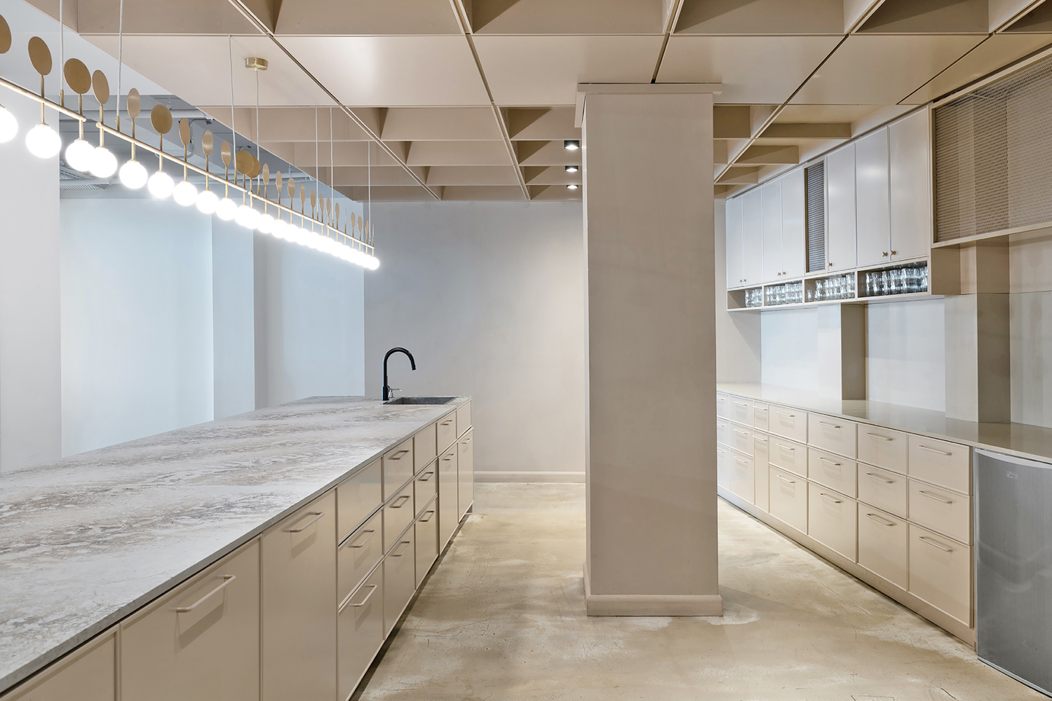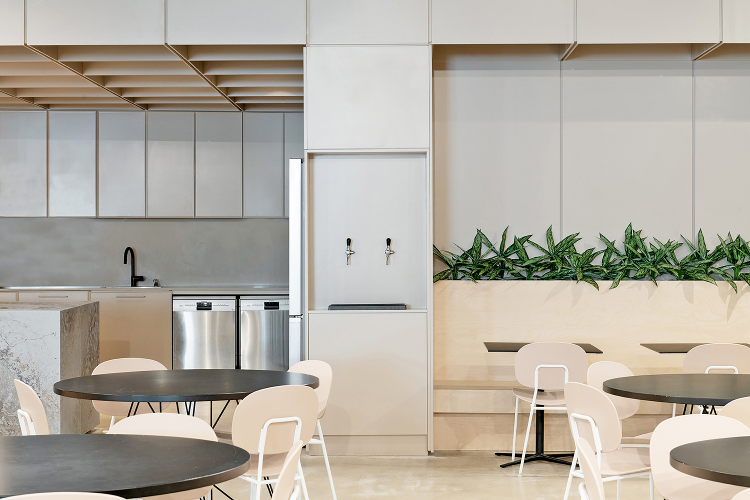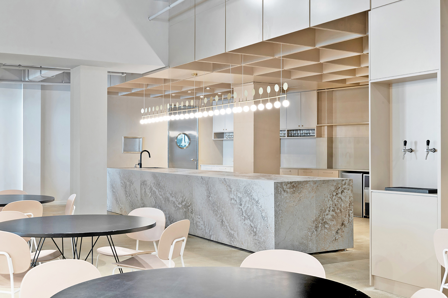 两座主楼的屋顶上有一个大阳台,可以俯瞰城南的屋顶。建筑师决定留下“白盒子”并暴露由混凝土制成的结构元件。天花板的裸露系统被漆成精致的灰色,窗户开口被扩大,以加强内部和外部之间的联系。广泛使用明亮的桦木和石英表面,精致的自然色调与浅色墙壁相结合,让自然光自由地进入空间。主厨房里有一个 9 米长的工作岛,用作全天供应食物的盘子。这个岛就像酒吧一样,在工作时间成为一个繁荣的空间。