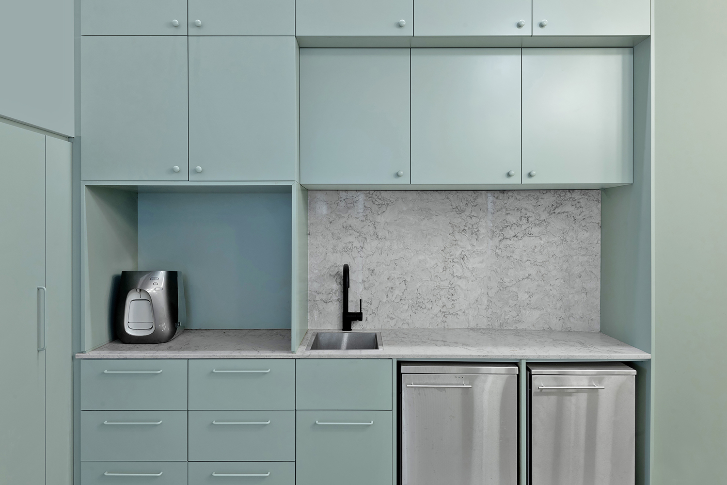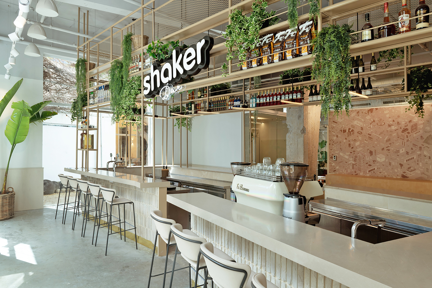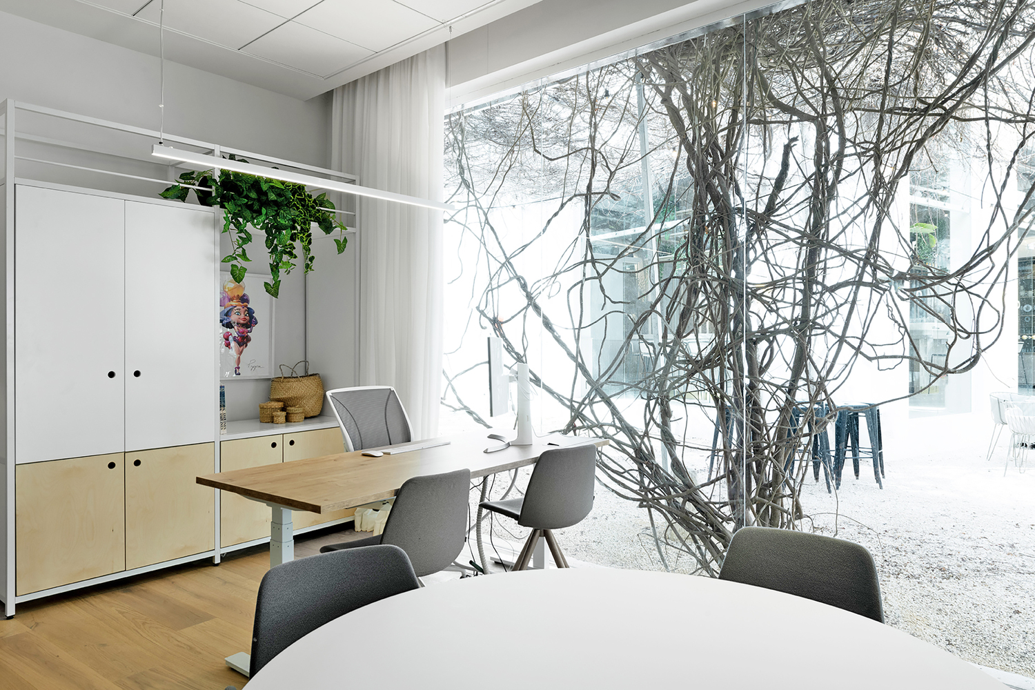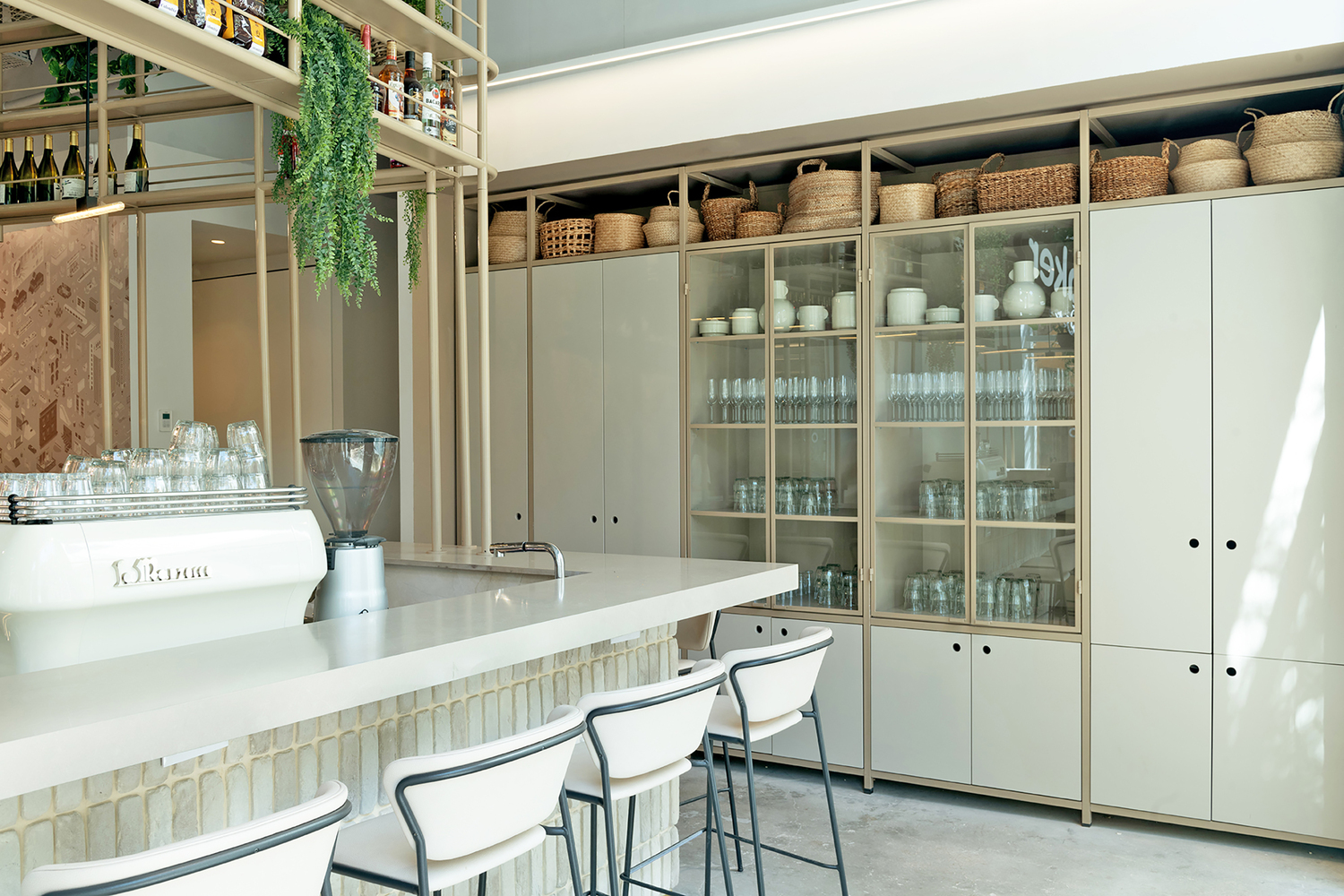 两座主楼的屋顶上有一个大阳台,可以俯瞰城南的屋顶。建筑师决定留下“白盒子”并暴露由混凝土制成的结构元件。天花板的裸露系统被漆成精致的灰色,窗户开口被扩大,以加强内部和外部之间的联系。广泛使用明亮的桦木和石英表面,精致的自然色调与浅色墙壁相结合,让自然光自由地进入空间。主厨房里有一个 9 米长的工作岛,用作全天供应食物的盘子。这个岛就像酒吧一样,在工作时间成为一个繁荣的空间。