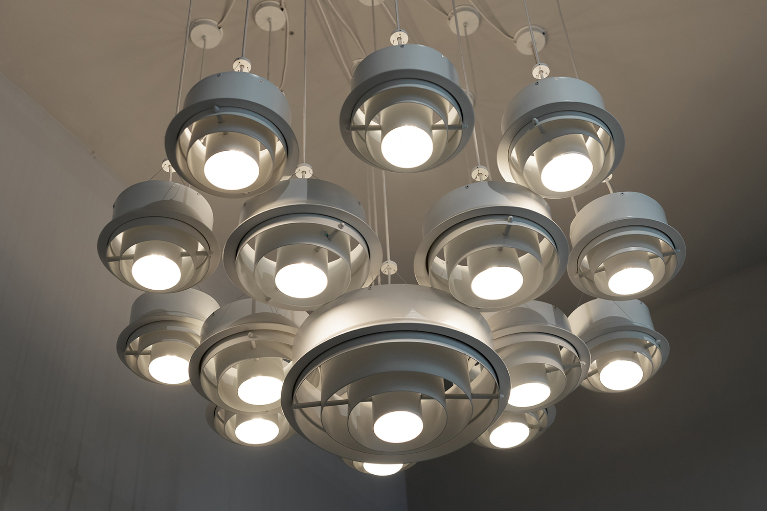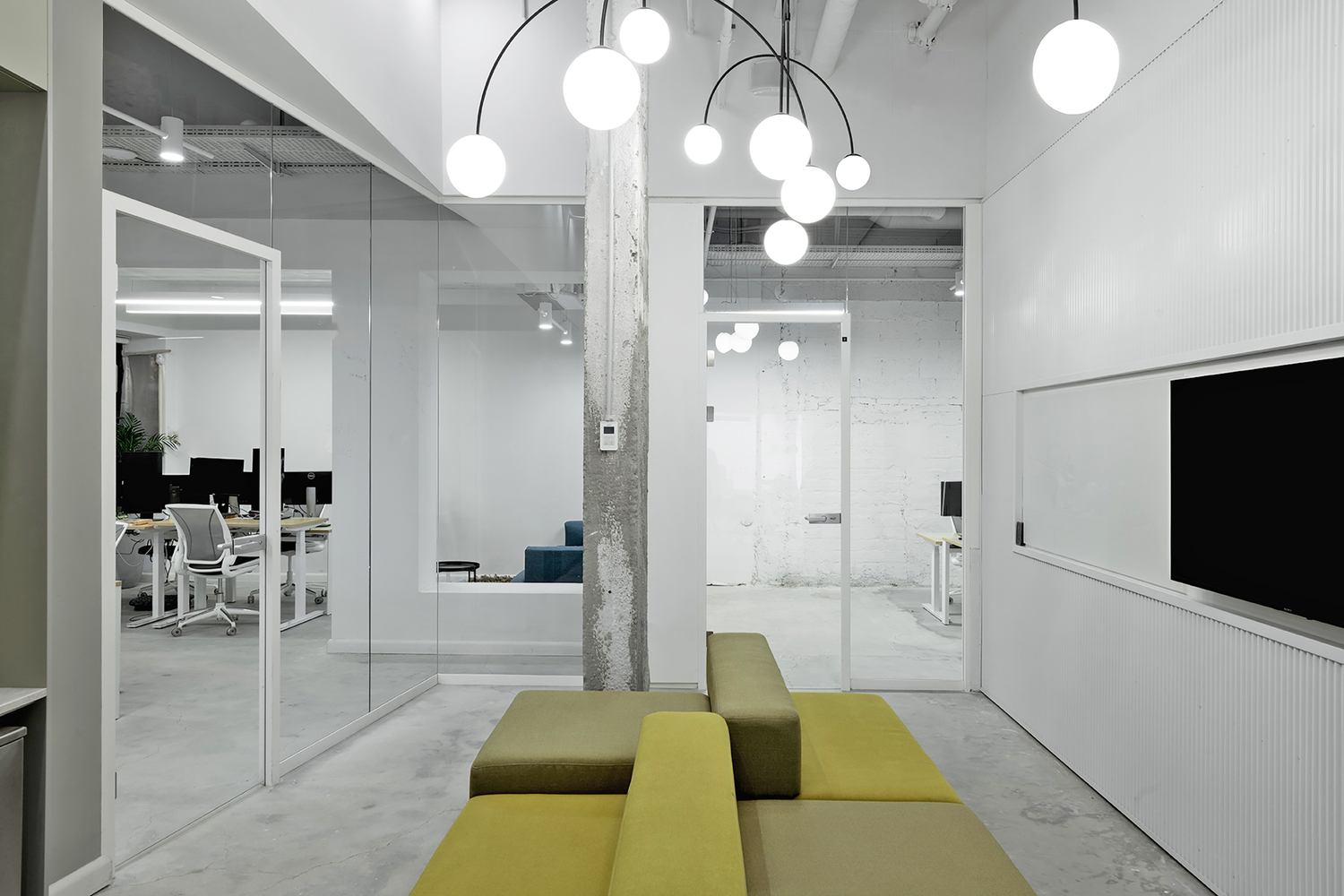 建筑师创建了一个照明装置系统,可以提供多种选择:集中照明、齐平照明、空间中央照明或员工个人照明。除了技术照明之外,还选择了经典的照明灯具来完善工业化的天花板和宽大的混凝土柱子。